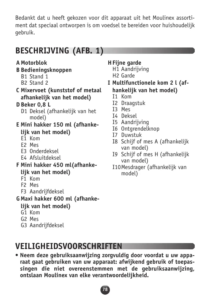 Bedankt dat u heeft gekozen voor dit apparaat uit het Moulinex assortiment dat speciaal ontworpen is om voedsel te bereiden voor huishoudelijk gebruik. BESCHRIJVING (AFB. 1) A Motorblok B Bedieningsknoppen B1 Stand 1 B2 Stand 2 C Mixervoet (kunststof of metaal afhankelijk van het model) D Beker 0,8 L D1 Deksel (afhankelijk van het model) E Mini hakker 150 ml (afhankelijk van het model) E1 Kom E2 Mes E3 Onderdeksel E4 Afsluitdeksel F Mini hakker 450 ml(afhankelijk van het model) F1 Kom F2 Mes F3 Aandrijfdeksel G Maxi hakker 600 ml (afhankelijk van het model) G1 Kom G2 Mes G3 Aandrijfdeksel H Fijne garde H1 Aandrijving H2 Garde I Multifunctionele kom 2 l (afhankelijk van het model) I1 Kom I2 Draagstuk I3 Mes I4 Deksel I5 Aandrijving I6 Ontgrendelknop I7 Duwstuk I8 Schijf of mes A (afhankelijk van model) I9 Schijf of mes H (afhankelijk van model) I10Mesdrager (afhankelijk van model) VEILIGHEIDSVOORSCHRIFTEN