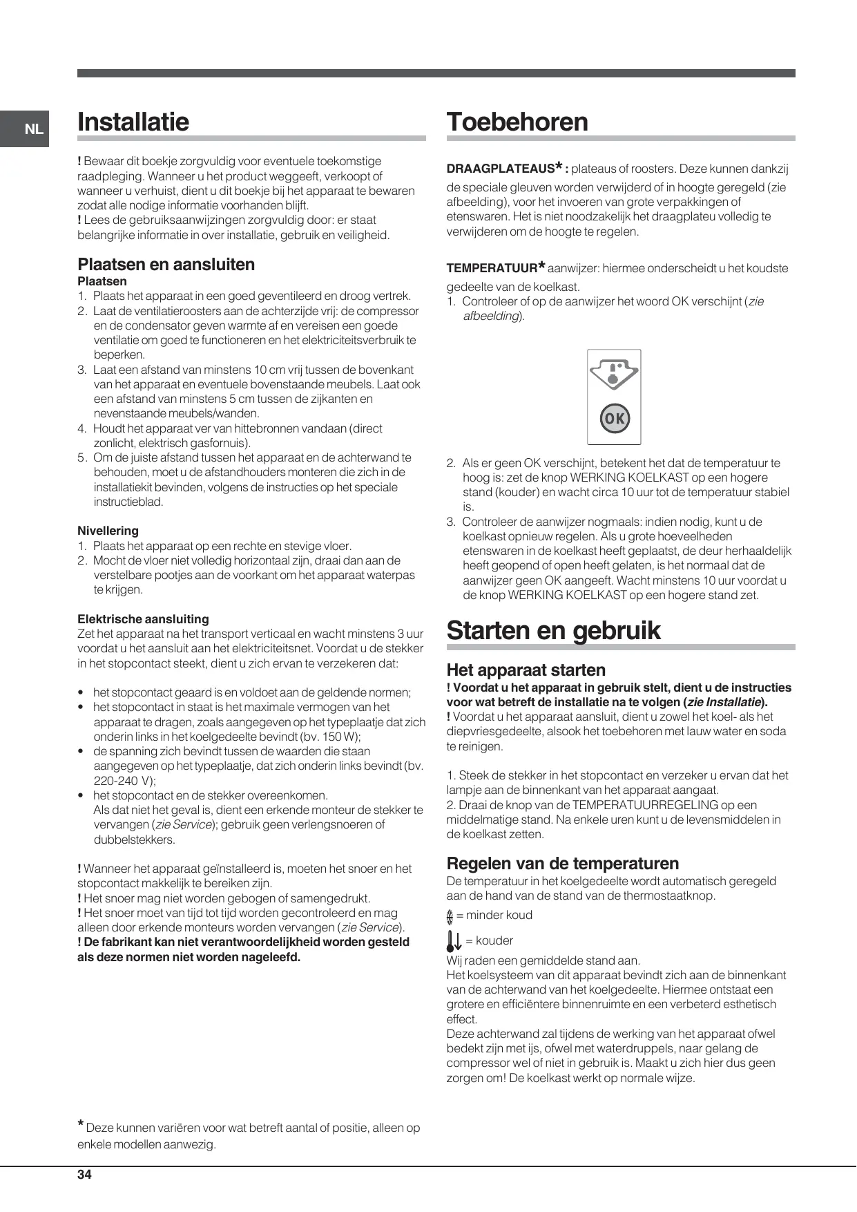 2. Als er geen OK verschijnt, betekent het dat de temperatuur te hoog is: zet de knop WERKING KOELKAST op een hogere stand (kouder) en wacht circa 10 uur tot de temperatuur stabiel is. 3. Controleer de aanwijzer nogmaals: indien nodig, kunt u de koelkast opnieuw regelen. Als u grote hoeveelheden etenswaren in de koelkast heeft geplaatst, de deur herhaaldelijk heeft geopend of open heeft gelaten, is het normaal dat de aanwijzer geen OK aangeeft. Wacht minstens 10 uur voordat u de knop WERKING KOELKAST op een hogere stand zet.