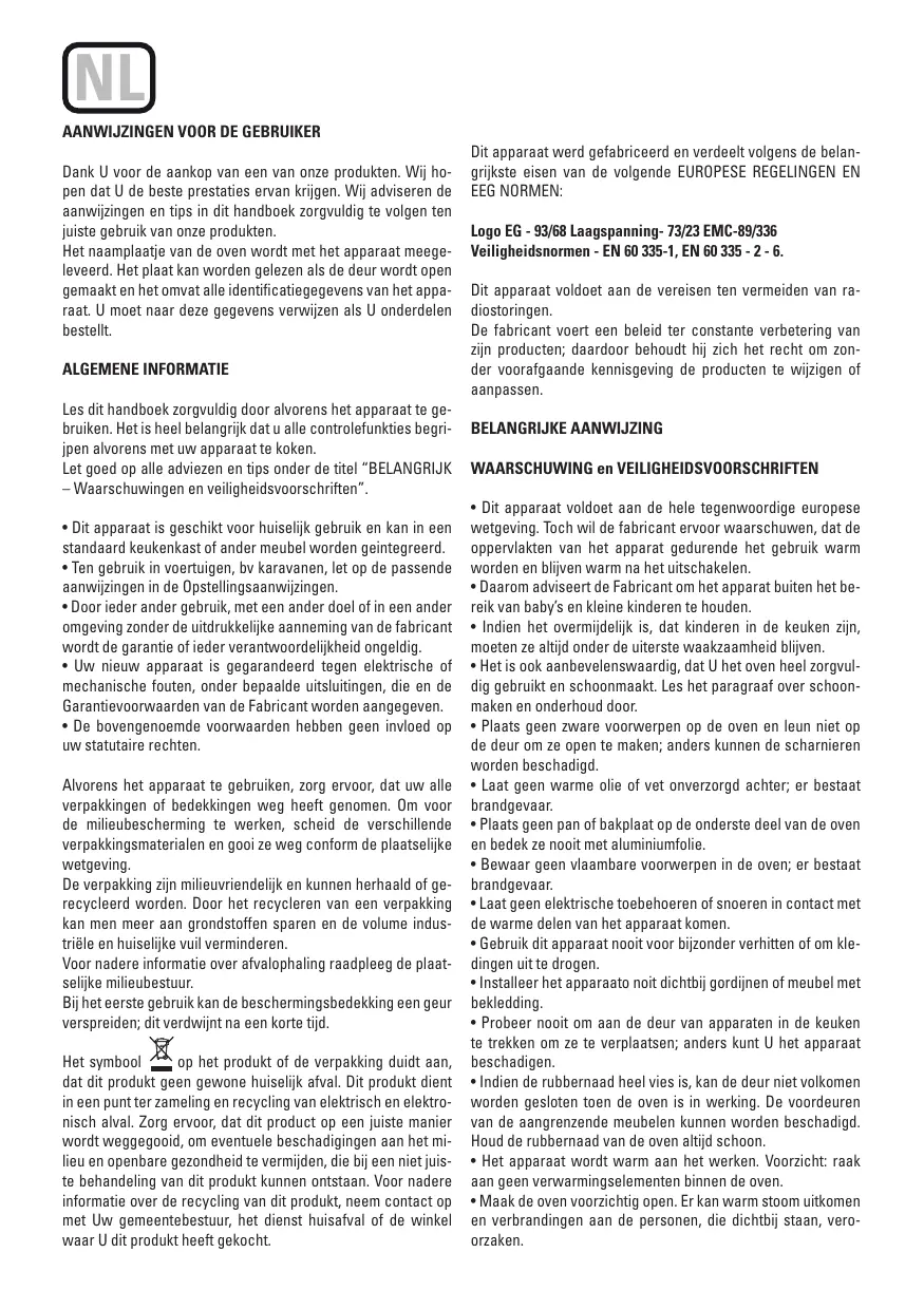 - Bij het gebruik geeft het apparaat warmt, stoom en vochtigheid. Vermeid allerlei persoonlijke schaden en zorg ervoor, dat de ruimte genoeg is geventieleerd. Bij een langdurig gebruik, kan er extra ventilatie nodig worden – raadpleeg Uw installateur voor ieder vraag over de nodige volume. GEBRUIKSAANWIJZINGEN Bewaar dit Gebruikshandboek voer toekomstige raadpleging of voor het gebruik door een persoon, die niet met het apparaat vertrouwd is. Alvorens de oven te gebruiken, maak ze zorgvuldig schoon met niet schurend zeep en lauw water. Plaats de rooster en de bakplaat in hun respektieve geleidebed. Daarna, schakel de oven op de hoogste temperatuur gedurende ca. 20 minuut om ieder rest van vet, olie of hars te verwijderen, die gedurende het keuken onaangename geuren kunnen veroorzaken. OPGELET: Gedurende dit eerst keuken kan er een beetje stoom of een onaangenaam geur uit de oven komen. In dit geval, ventileer de ruimte totdat de eerste funktie is volledig uitgevoerd. Un is de oven klaar voor het gebruik. Dit apparaat is uitsluitend geschikt voor huiselijk gebruik. Gebruik deze oven alleen om voedsels te koken.