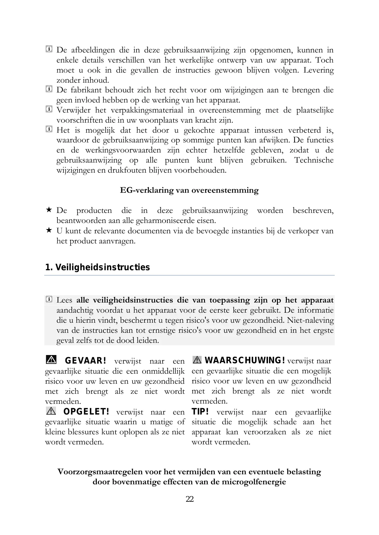 Lees alle veiligheidsinstructies die van toepassing zijn op het apparaat aandachtig voordat u het apparaat voor de eerste keer gebruikt. De informatie die u hierin vindt, beschermt u tegen risico's voor uw gezondheid. Niet-naleving van de instructies kan tot ernstige risico's voor uw gezondheid en in het ergste geval zelfs tot de dood leiden. GEVAAR! verwijst naar een gevaarlijke situatie die een onmiddellijk risico voor uw leven en uw gezondheid met zich brengt als ze niet wordt vermeden. OPGELET! verwijst naar een gevaarlijke situatie waarin u matige of kleine blessures kunt oplopen als ze niet wordt vermeden. WAARSCHUWING! verwijst naar een gevaarlijke situatie die een mogelijk risico voor uw leven en uw gezondheid met zich brengt als ze niet wordt vermeden. TIP! verwijst naar een gevaarlijke situatie die mogelijk schade aan het apparaat kan veroorzaken als ze niet wordt vermeden. Voorzorgsmaatregelen voor het vermijden van een eventuele belasting door bovenmatige effecten van de microgolfenergie