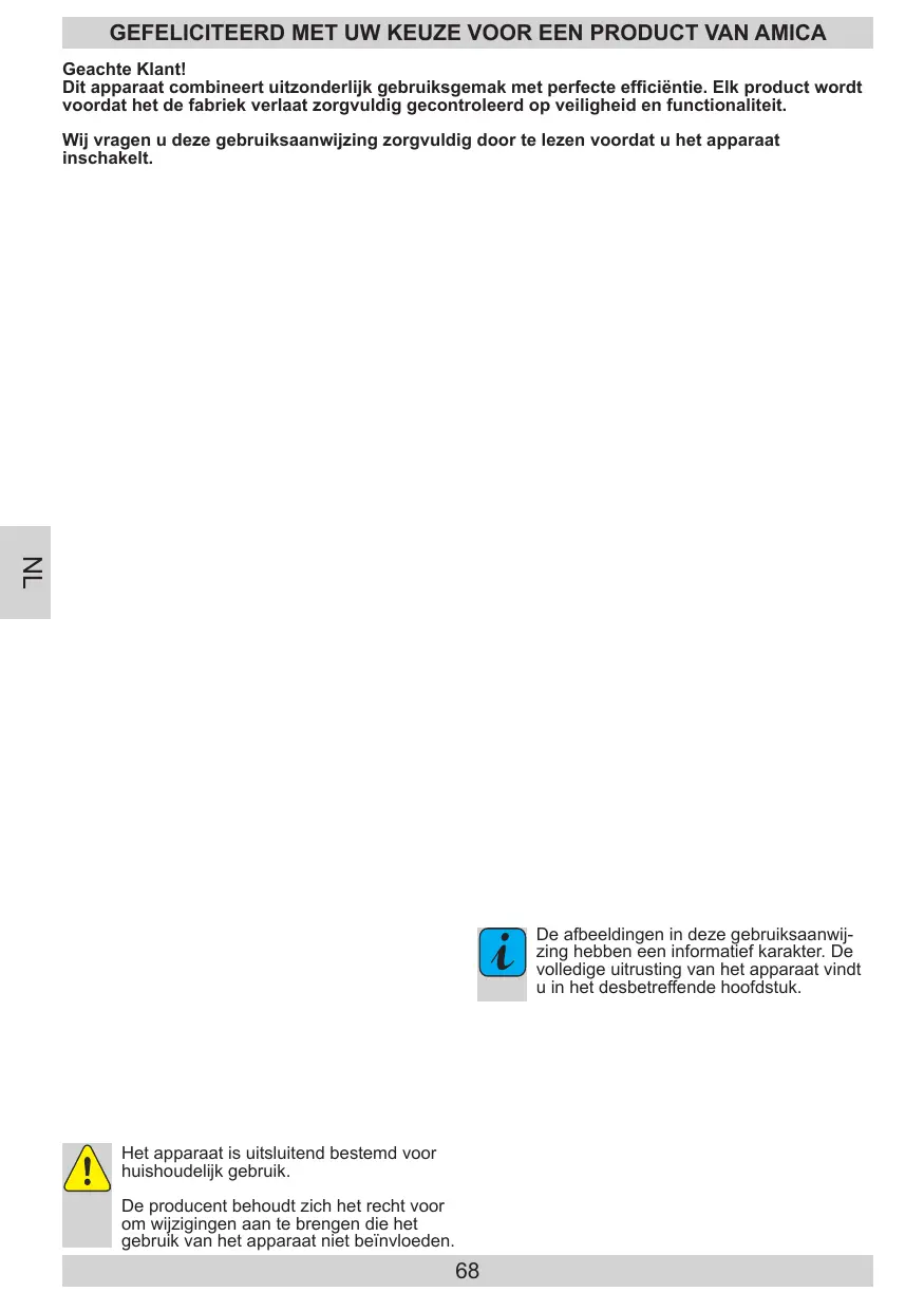 GEFELICITEERD MET UW KEUZE VOOR EEN PRODUCT VAN AMICA Geachte Klant! Dit apparaat combineert uitzonderlijk gebruiksgemak met perfecte efficiëntie. Elk product wordt voordat het de fabriek verlaat zorgvuldig gecontroleerd op veiligheid en functionaliteit. Wij vragen u deze gebruiksaanwijzing zorgvuldig door te lezen voordat u het apparaat inschakelt.
