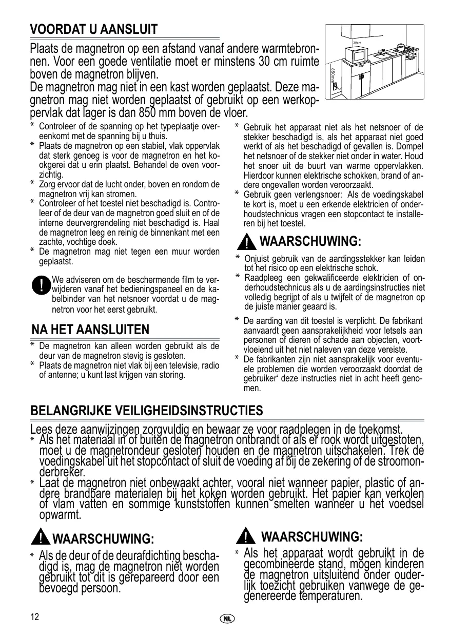 - Plaats de magnetron niet vlak bij een televisie, radio of antenne; u kunt last krijgen van storing. BELANGRIJKE VEILIGHEIDSINSTRUCTIES Lees deze aanwijzingen zorgvuldig en bewaar ze voor raadplegen in de toekomst.