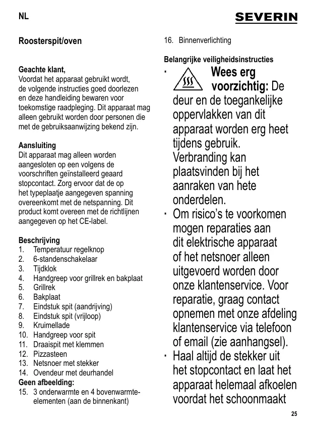 Geachte klant, ∙ Reinig de ruit en droog haar goed af. ∙ Om de ruit terug te plaatsen, legt u haar zodanig dat de bredere afdichting naar beneden wijst. ∙ Plaats de 2 metalen houders, en schroef ze vast met de 4 schroeven. ∙ Laat de pizzasteen geheel afkoelen voordat men deze schoonmaakt. Achtergebleven voedselresten kunnen afgekrabd worden met een houten spatel. Omdat het oppervlak poreus is, is verkleuring ervan door contact met voedsel vrij normaal. 1. Mando de control de temperatura 2. Interruptor de 6 posiciones 3. Temporizador 4. Mango para la parrilla y la bandeja de horneado 5. Parrilla de hornear 6. Bandeja de hornear 7. Pieza final del asador (conexión al eje transmisor) 8. Pieza final del asador (sin movimiento) 9. Bandeja de migas 10. Mango para el montaje del asador Para la limpieza, tenga en cuenta las indicaciones de la sección «Limpieza y cuidado». El aparato no debe ser utilizado con un