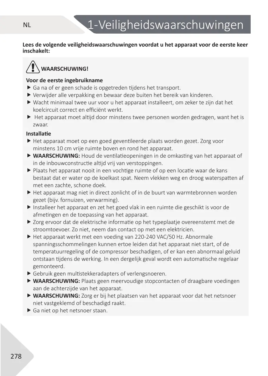 Lees de volgende veiligheidswaarschuwingen voordat u het apparaat voor de eerste keer inschakelt: WAARSCHUWING! Voor de eerste ingebruikname f Ga na of er geen schade is opgetreden tijdens het transport. f Verwijder alle verpakking en bewaar deze buiten het bereik van kinderen. f Wacht minimaal twee uur voor u het apparaat installeert, om zeker te zijn dat het koelcircuit correct en efficiënt werkt. f Het apparaat moet altijd door minstens twee personen worden gedragen, want het is zwaar. Installatie f Het apparaat moet op een goed geventileerde plaats worden gezet. Zorg voor minstens 10 cm vrije ruimte boven en rond het apparaat. f WAARSCHUWING: Houd de ventilatieopeningen in de omkasting van het apparaat of in de inbouwconstructie altijd vrij van verstoppingen. f Plaats het apparaat nooit in een vochtige ruimte of op een locatie waar de kans bestaat dat er water op de koelkast spat. Neem vlekken weg en droog waterspatten af met een zachte, schone doek. f Het apparaat mag niet in direct zonlicht of in de buurt van warmtebronnen worden gezet (bijv. fornuizen, verwarming). f Installeer het apparaat en zet het goed vlak in een ruimte die geschikt is voor de afmetingen en de toepassing van het apparaat. f Zorg ervoor dat de elektrische informatie op het typeplaatje overeenstemt met de stroomtoevoer. Zo niet, neem dan contact op met een elektricien. f Het apparaat werkt met een voeding van 220‑240 VAC/50 Hz. Abnormale spanningsschommelingen kunnen ertoe leiden dat het apparaat niet start, of de temperatuurregeling of de compressor beschadigen, of er kan een abnormaal geluid ontstaan tijdens de werking. In een dergelijk geval wordt een automatische regelaar gemonteerd. f Gebruik geen multistekkeradapters of verlengsnoeren. f WAARSCHUWING: Plaats geen meervoudige stopcontacten of draagbare voedingen aan de achterzijde van het apparaat. f WAARSCHUWING: Zorg er bij het plaatsen van het apparaat voor dat het netsnoer niet vastgeklemd of beschadigd raakt. f Ga niet op het netsnoer staan.