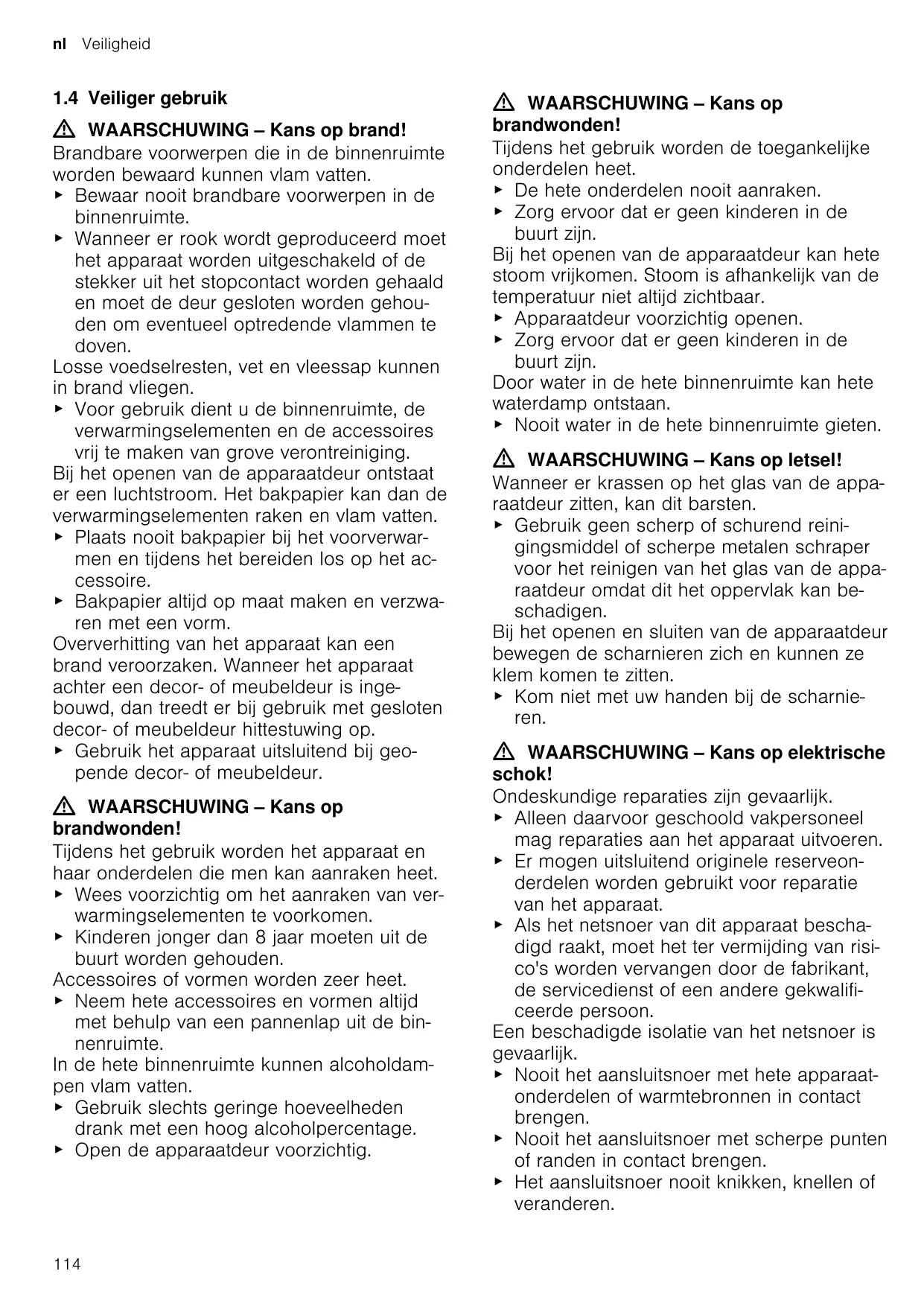 1.4 Veiliger gebruik WAARSCHUWING ‒ Kans op brand! Brandbare voorwerpen die in de binnenruimte worden bewaard kunnen vlam vatten. ▶ Bewaar nooit brandbare voorwerpen in de binnenruimte. ▶ Wanneer er rook wordt geproduceerd moet het apparaat worden uitgeschakeld of de stekker uit het stopcontact worden gehaald en moet de deur gesloten worden gehouden om eventueel optredende vlammen te doven. Losse voedselresten, vet en vleessap kunnen in brand vliegen. ▶ Voor gebruik dient u de binnenruimte, de verwarmingselementen en de accessoires vrij te maken van grove verontreiniging. Bij het openen van de apparaatdeur ontstaat er een luchtstroom. Het bakpapier kan dan de verwarmingselementen raken en vlam vatten. ▶ Plaats nooit bakpapier bij het voorverwarmen en tijdens het bereiden los op het accessoire. ▶ Bakpapier altijd op maat maken en verzwaren met een vorm. Oververhitting van het apparaat kan een brand veroorzaken. Wanneer het apparaat achter een decor- of meubeldeur is ingebouwd, dan treedt er bij gebruik met gesloten decor- of meubeldeur hittestuwing op. ▶ Gebruik het apparaat uitsluitend bij geopende decor- of meubeldeur. WAARSCHUWING ‒ Kans op brandwonden! Tijdens het gebruik worden het apparaat en haar onderdelen die men kan aanraken heet. ▶ Wees voorzichtig om het aanraken van verwarmingselementen te voorkomen. ▶ Kinderen jonger dan 8 jaar moeten uit de buurt worden gehouden. Accessoires of vormen worden zeer heet. ▶ Neem hete accessoires en vormen altijd met behulp van een pannenlap uit de binnenruimte. In de hete binnenruimte kunnen alcoholdampen vlam vatten. ▶ Gebruik slechts geringe hoeveelheden drank met een hoog alcoholpercentage. ▶ Open de apparaatdeur voorzichtig.