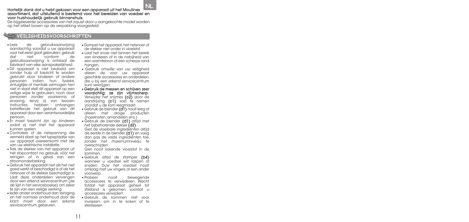 • Ne mettez pas l’appareil, le câble d’alimentation ou la fiche dans du liquide. • Ne laissez pas le câble d’alimentation à portée de mains des enfants, près d’une source de chaleur ou sur un angle vif. • Pour votre sécurité, ne pas utiliser d’accessoires ou de pièces de rechange, autres que ceux fournis par les centres de service après-vente agréés. • Manipulez les couteaux et les disques avec précaution : ils sont extrêmement aiguisés. Vous devez obligatoirement retirer le couteau hachoir (c 2) par son entraîneur (c 1) avant de vider le bol de son contenu. • N’utilisez pas le bol blender (d 1) à vide ou seulement avec des produits secs (noisettes, amandes,..) • Utilisez toujours le bol blender (d 1) ( d2 ). avec son couvercle Versez toujours les ingrédients liquides en premier dans le bol blender (d1 ), avant d’ajouter des ingrédients solides, sans dépasser le niveau maximal. Ne versez jamais de liquide bouillant dans les bols. • Lorsque vous souhaitez râper ou trancher des aliments, utilisez toujours le poussoir ( b4) . Ne jamais introduire les aliments avec les mains, ni avec un ustensile. • Ne jamais tenter de retirer les accessoires en mouvement. Attendez l’arrêt complet de l’appareil avant d’enlever les accessoires. • Ne pas utiliser les bols comme récipients de congélation, cuisson ou stérilisation.