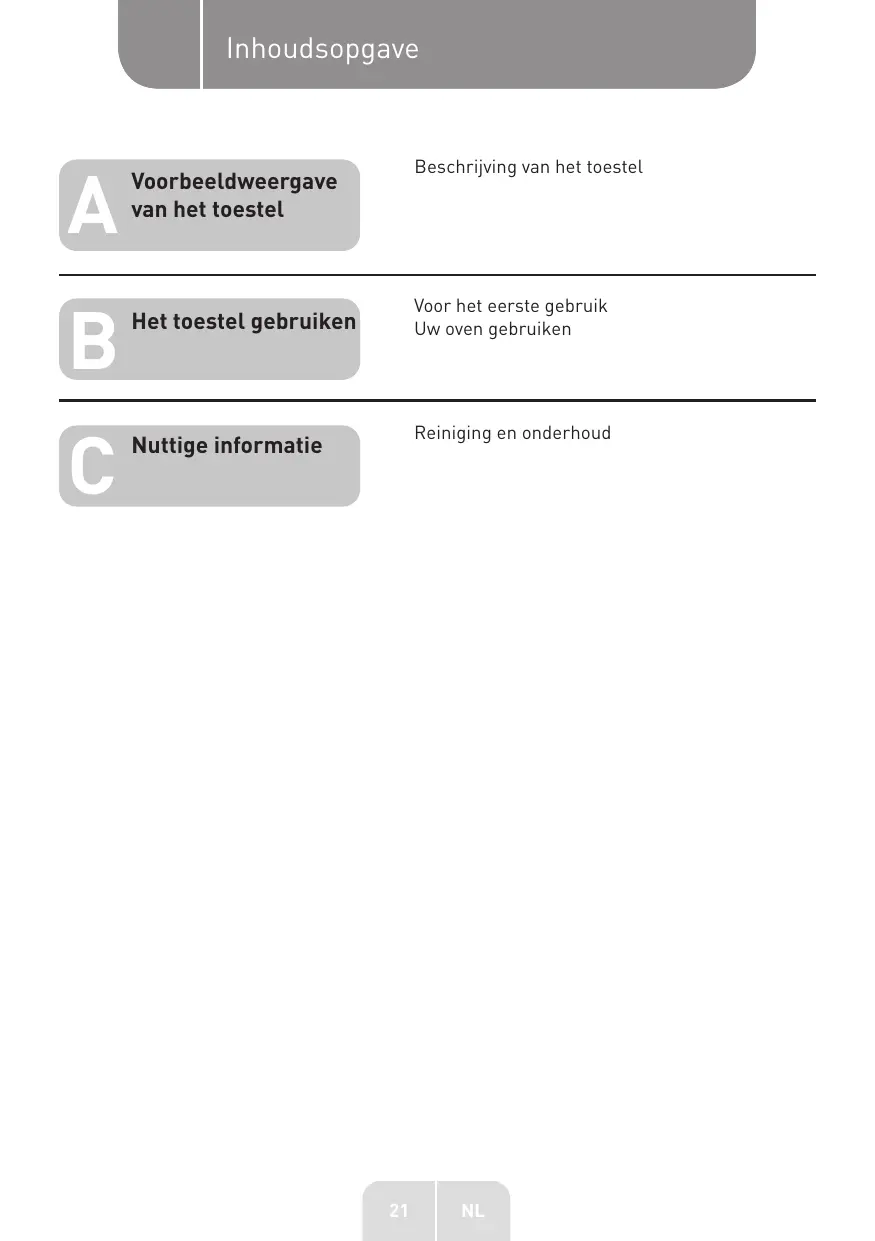 Aperçu de l’appareil Inhoudsopgave Beschrijving van het toestel Voorbeeldweergave van het toestel Voor het eerste gebruik Uw oven gebruiken Het toestel gebruiken Reiniging en onderhoud Nuttige informatie