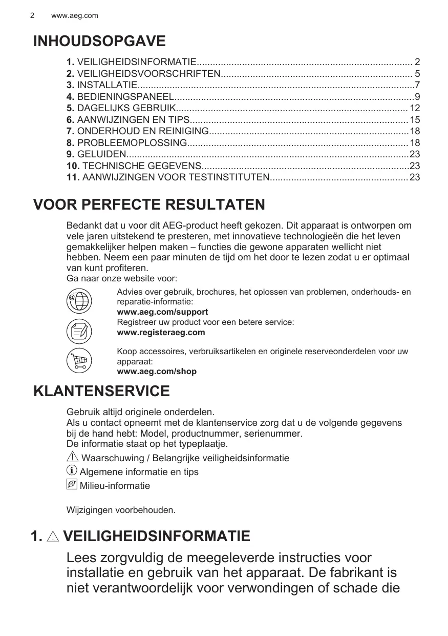 Bedankt dat u voor dit AEG-product heeft gekozen. Dit apparaat is ontworpen om vele jaren uitstekend te presteren, met innovatieve technologieën die het leven gemakkelijker helpen maken — functies die gewone apparaten wellicht niet hebben. Neem een paar minuten de tijd om het door te lezen zodat u er optimaal van kunt profiteren. Ga naar onze website voor: Advies over gebruik, brochures, het oplossen van problemen, onderhouds- en reparatie-informatie: www.aeg.com/support Registreer uw product voor een betere service: www.registeraeg.com Koop accessoires, verbruiksartikelen en originele reserveonderdelen voor uw apparaat: www.aeg.com/shop KLANTENSERVICE Gebruik altijd originele onderdelen. Als u contact opneemt met de klantenservice zorg dat u de volgende gegevens bij de hand hebt: Model, productnummer, serienummer. De informatie staat op het typeplaatje. ÂÀ Waarschuwing / Belangrijke veiligheidsinformatie eo Algemene informatie en tips Milieu-informatie Wijzigingen voorbehouden.