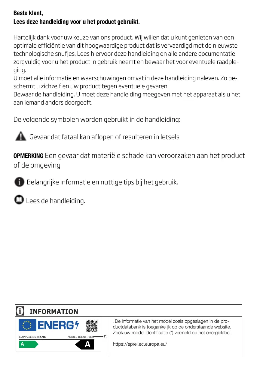 .De informatie van het model zoals opgeslagen in de productdatabank is toegankelijk op de onderstaande website. Zoek uw model identificatie (*) vermeld op het energielabel. https://eprel.ec.europa.eu/