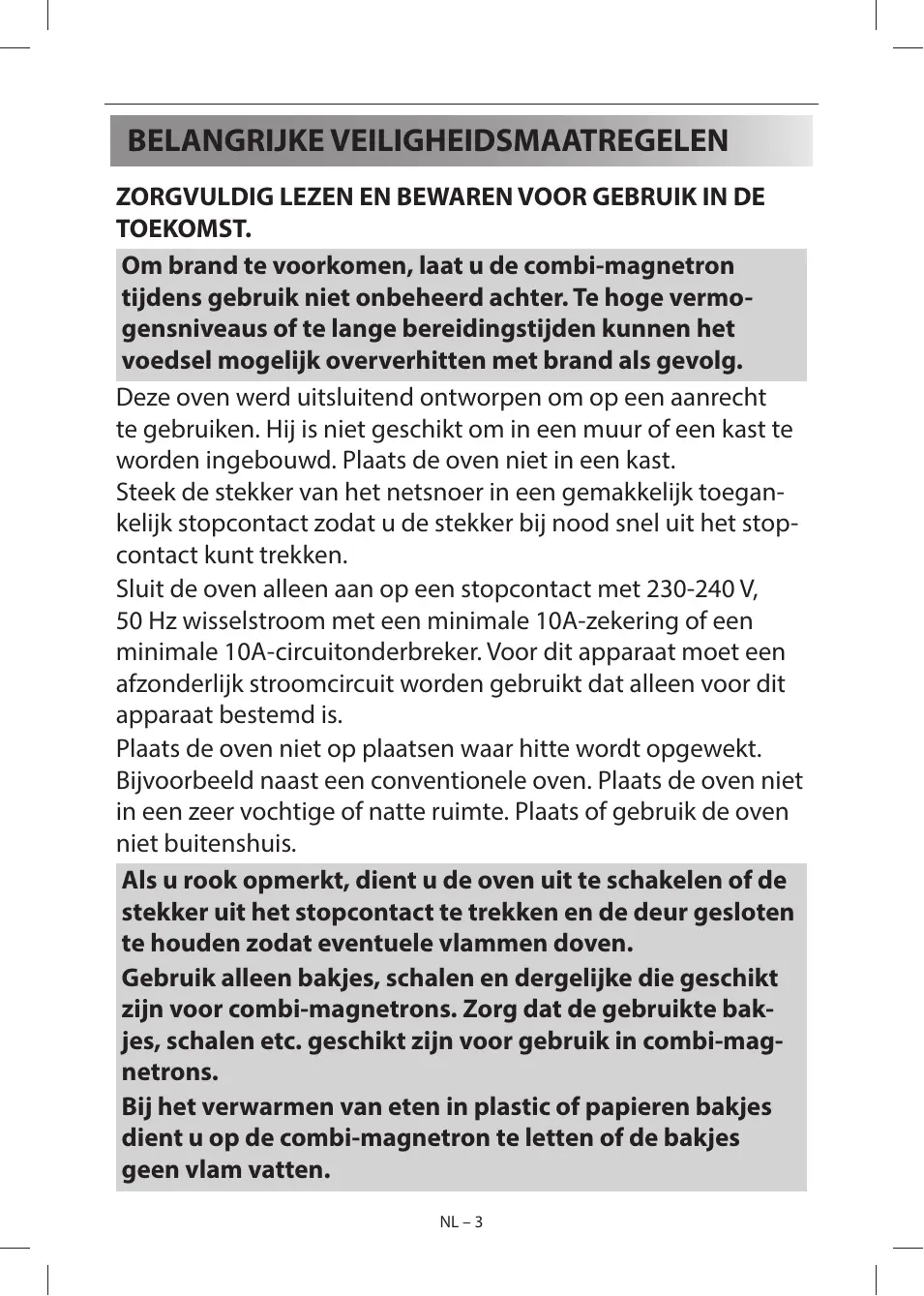 - VOORDAT U HULP INROEPT NL – 2 BELANGRIJKE VEILIGHEIDSMAATREGELEN ZORGVULDIG LEZEN EN BEWAREN VOOR GEBRUIK IN DE TOEKOMST. Om brand te voorkomen, laat u de combi-magnetron tijdens gebruik niet onbeheerd achter. Te hoge vermogensniveaus of te lange bereidingstijden kunnen het voedsel mogelijk oververhitten met brand als gevolg. Deze oven werd uitsluitend ontworpen om op een aanrecht te gebruiken. Hij is niet geschikt om in een muur of een kast te worden ingebouwd. Plaats de oven niet in een kast. Steek de stekker van het netsnoer in een gemakkelijk toegankelijk stopcontact zodat u de stekker bij nood snel uit het stopcontact kunt trekken. Sluit de oven alleen aan op een stopcontact met 230-240 V, 50 Hz wisselstroom met een minimale 10A-zekering of een minimale 10A-circuitonderbreker. Voor dit apparaat moet een afzonderlijk stroomcircuit worden gebruikt dat alleen voor dit apparaat bestemd is. Plaats de oven niet op plaatsen waar hitte wordt opgewekt. Bijvoorbeeld naast een conventionele oven. Plaats de oven niet in een zeer vochtige of natte ruimte. Plaats of gebruik de oven niet buitenshuis. Als u rook opmerkt, dient u de oven uit te schakelen of de stekker uit het stopcontact te trekken en de deur gesloten te houden zodat eventuele vlammen doven. Gebruik alleen bakjes, schalen en dergelijke die geschikt zijn voor combi-magnetrons. Zorg dat de gebruikte bakjes, schalen etc. geschikt zijn voor gebruik in combi-magnetrons. Bij het verwarmen van eten in plastic of papieren bakjes dient u op de combi-magnetron te letten of de bakjes geen vlam vatten. NL – 3 p. 31