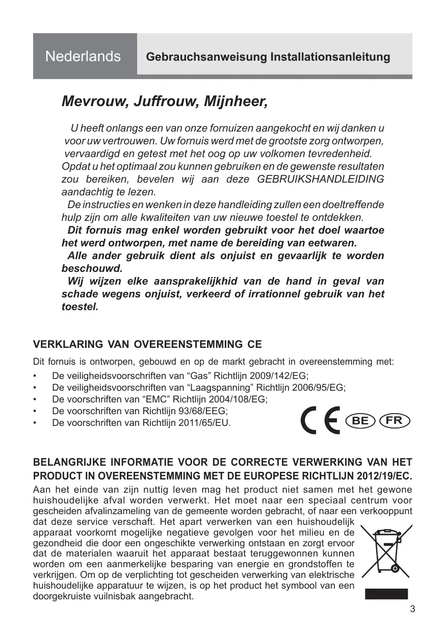 U heeft onlangs een van onze fornuizen aangekocht en wij danken u voor uw vertrouwen. Uw fornuis werd met de grootste zorg ontworpen, vervaardigd en getest met het oog op uw volkomen tevredenheid. Opdat u het optimaal zou kunnen gebruiken en de gewenste resultaten zou bereiken, bevelen wi aan deze GEBRUIKSHANDLEIDING aandachtig te lezen.