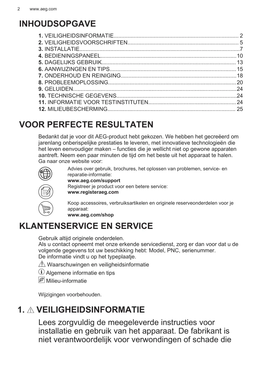 Bedankt dat je voor dit AEG-product hebt gekozen. We hebben het gecreëerd om jarenlang onberispelijke prestaties te leveren, met innovatieve technologieën die het leven eenvoudiger maken – functies die je wellicht niet op gewone apparaten aantreft. Neem een paar minuten de tijd om het beste uit het apparaat te halen. Ga naar onze website voor: Advies over gebruik, brochures, het oplossen van problemen, service- en reparatie-informatie: www.aeg.com/support Registreer je product voor een betere service: www.registeraeg.com Koop accessoires, verbruiksartikelen en originele reserveonderdelen voor je apparaat: www.aeg.com/shop