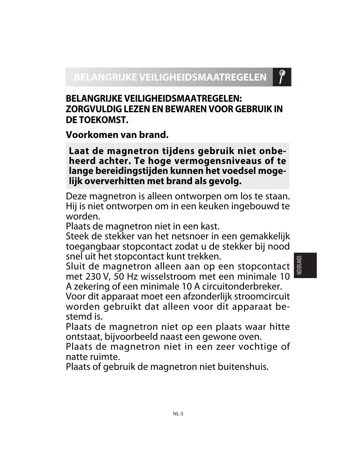 Ce four est conçu pour être uniquement utilisé sur un plan de travail de cuisine. Il n'est pas conçu pour être installé dans un élément de cuisine. Veuillez ne pas placer le four dans un placard. La prise secteur doit être facilement accessible, afin que la fiche du cordon d’alimentation puisse être aisément débranchée en cas d’urgence. La tension d’alimentation doit être égale à 230 V, 50 Hz avec un fusible de distribution de 10 A minimum, ou un disjoncteur de 10 A minimum. Ce four doit être alimenté à partir d’un circuit électrique indépendant. Veuillez ne pas placer votre four à proximité d'une zone génératrice de chaleur. Par exemple, près d'un four à cuisson conventionnelle. Ne placez pas ce four dans une atmosphère à humidité élevée ou bien où l’humidité peut s'accumuler. Ne rangez pas et n’utilisez pas le four à l’extérieur. F-5