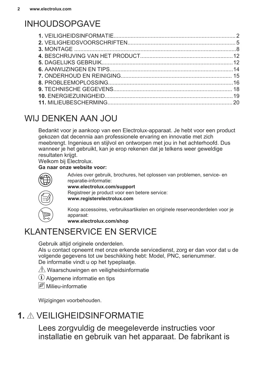 Bedankt voor je aankoop van een Electrolux-apparaat. Je hebt voor een product gekozen dat decennia aan professionele ervaring en innovatie met zich meebrengt. Ingenieus en stijlvol en ontworpen met jou in het achterhoofd. Dus wanneer je het gebruikt, kan je erop rekenen dat je telkens weer geweldige resultaten krijgt. Welkom bij Electrolux. Ga naar onze website voor: Advies over gebruik, brochures, het oplossen van problemen, service- en reparatie-informatie: www.electrolux.com/support Registreer je product voor een betere service: www.registerelectrolux.com Koop accessoires, verbruiksartikelen en originele reserveonderdelen voor je apparaat: www.electrolux.com/shop