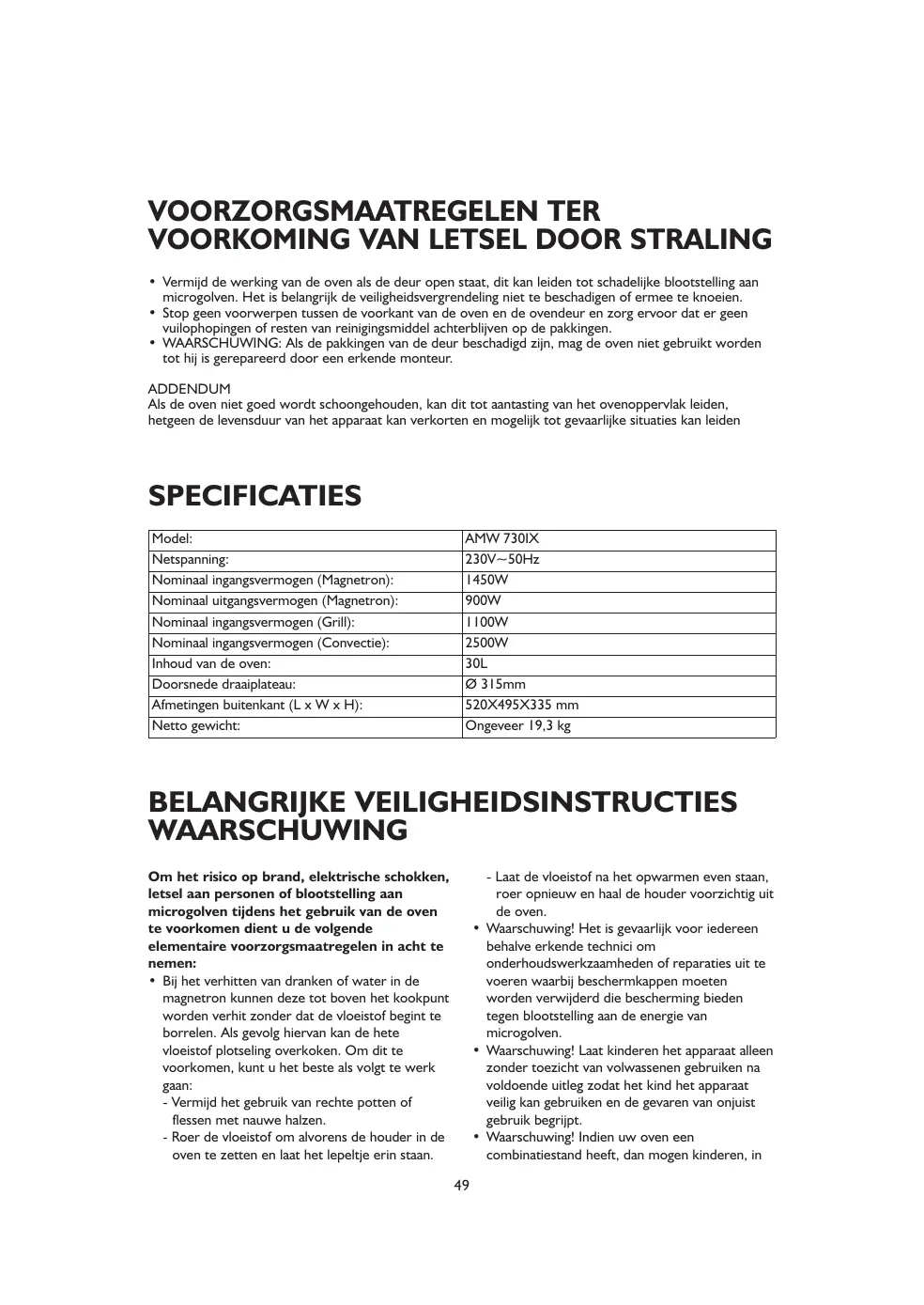 - WAARSCHUWING: Als de pakkingen van de deur beschadigd zijn, mag de oven niet gebruikt worden tot hij is gerepareerd door een erkende monteur. ADDENDUM Als de oven niet goed wordt schoongehouden, kan dit tot aantasting van het ovenoppervlak leiden, hetgeen de levensduur van het apparaat kan verkorten en mogelijk tot gevaarlijke situaties kan leiden SPECIFICATIES Model: Netspanning: Nominaal ingangsvermogen (Magnetron): Nominaal uitgangsvermogen (Magnetron): Nominaal ingangsvermogen (Grill): Nominaal ingangsvermogen (Convectie): Inhoud van de oven: Doorsnede draaiplateau: Afmetingen buitenkant (L x W x H): Netto gewicht: AMW 730IX 230V~50Hz 1450W 900W 1100W 2500W 30L Ø 315mm 520X495X335 mm Ongeveer 19,3 kg BELANGRIJKE VEILIGHEIDSINSTRUCTIES WAARSCHUWING Om het risico op brand, elektrische schokken, letsel aan personen of blootstelling aan microgolven tijdens het gebruik van de oven te voorkomen dient u de volgende elementaire voorzorgsmaatregelen in acht te nemen: