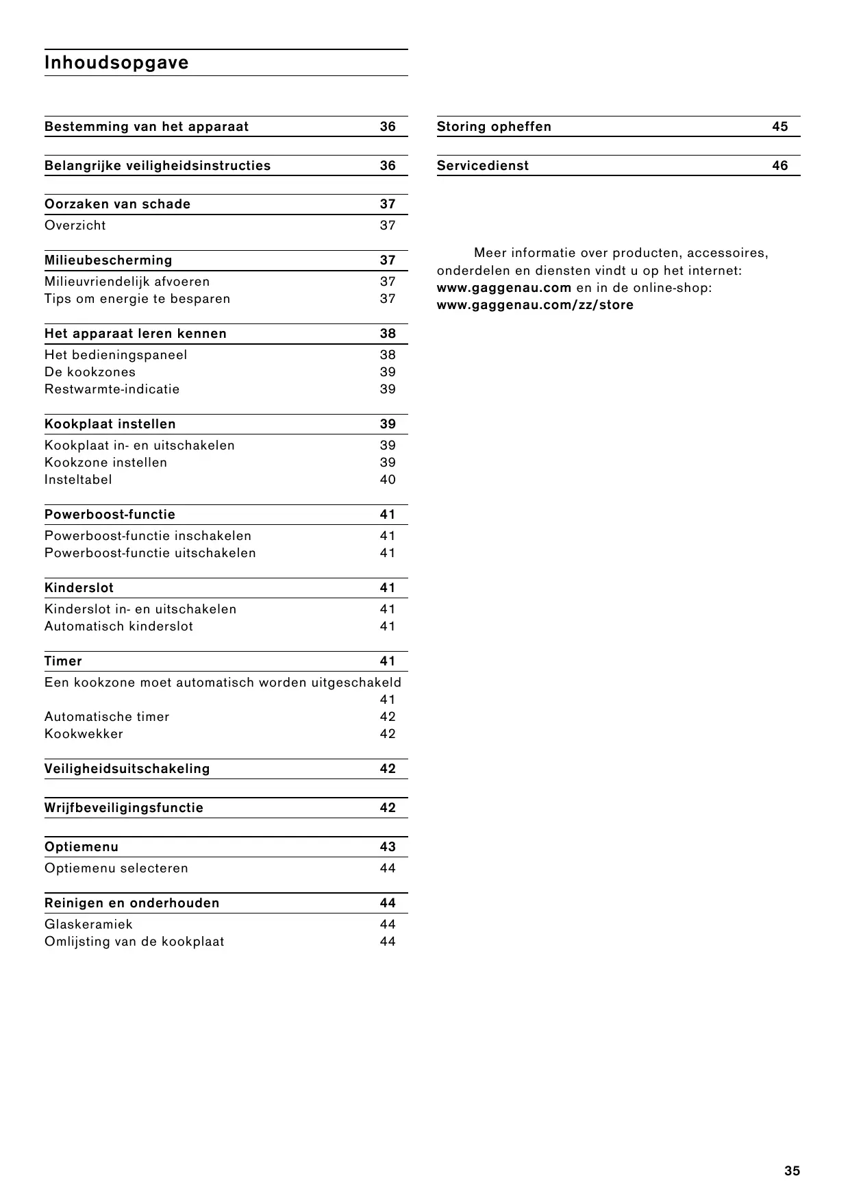 : Meer informatie over producten, accessoires, onderdelen en diensten vindt u op het internet: www.gaggenau.com en in de online-shop: www.gaggenau.com/zz/store Timer Een kookzone moet automatisch worden uitgeschakeld Automatische timer Kookwekker Veiligheidsuitschakeling