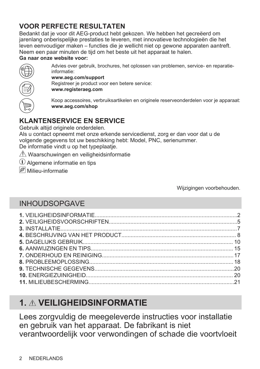 Obtenir des conseils d’utilisation, des brochures, un dépanneur, des informations sur le service et les réparations : www.aeg.com/support Enregistrer votre produit pour un meilleur service : www.registeraeg.com Acheter des accessoires, consommables et pièces de rechange d’origine pour votre appareil : www.aeg.com/shop