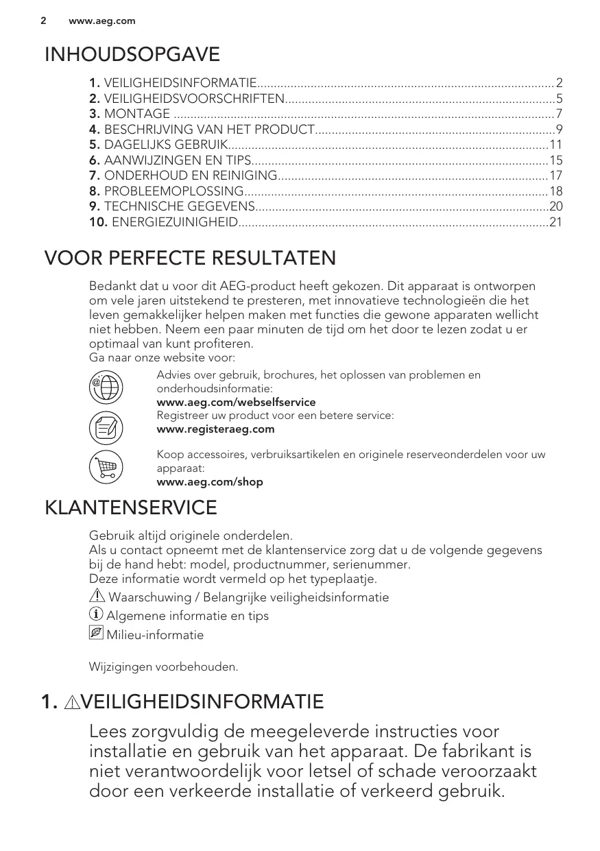 Bedankt dat u voor dit AEG-product heeft gekozen. Dit apparaat is ontworpen om vele jaren uitstekend te presteren, met innovatieve technologieën die het leven gemakkelijker helpen maken met functies die gewone apparaten wellicht niet hebben. Neem een paar minuten de tijd om het door te lezen zodat u er optimaal van kunt profiteren. Ga naar onze website voor: Advies over gebruik, brochures, het oplossen van problemen en onderhoudsinformatie: www.aeg.com/webselfservice Registreer uw product voor een betere service: www.registeraeg.com Koop accessoires, verbruiksartikelen en originele reserveonderdelen voor uw apparaat: www.aeg.com/shop KLANTENSERVICE Gebruik altijd originele onderdelen. Als u contact opneemt met de klantenservice zorg dat u de volgende gegevens bij de hand hebt: model, productnummer, serienummer. Deze informatie wordt vermeld op het typeplaatje. Waarschuwing / Belangrijke veiligheidsinformatie Algemene informatie en tips Milieu-informatie Wijzigingen voorbehouden.