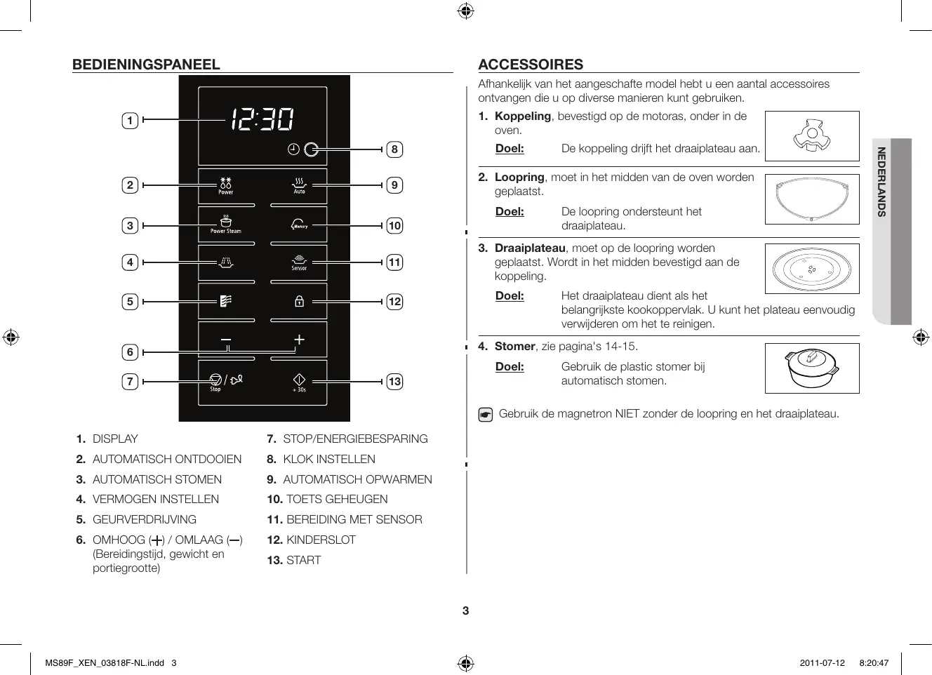 MS89F_XEN_03818F-NL.indd 2 2011-07-12 8:20:46 Bedieningspaneel Accessoires Afhankelijk van het aangeschafte model hebt u een aantal accessoires ontvangen die u op diverse manieren kunt gebruiken.