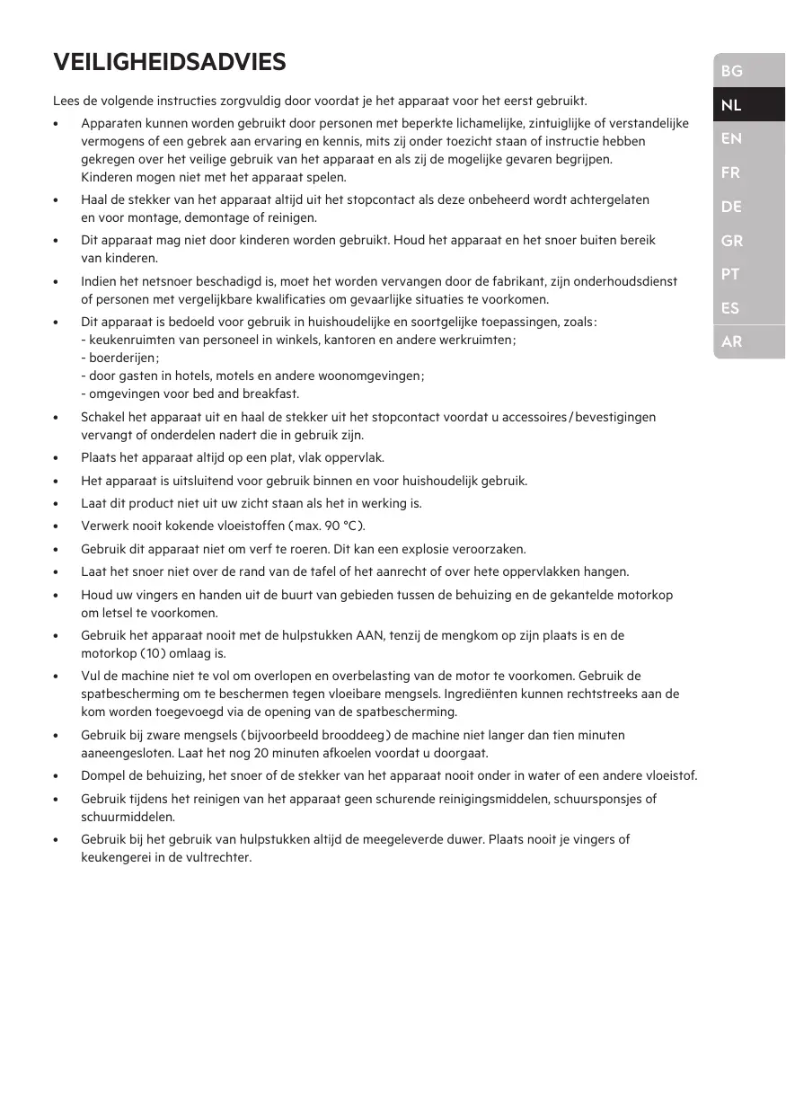 De motor werkt niet. Het apparaat is niet aangesloten op het stopcontact. Zorg ervoor dat u de stekker in het stopcontact steekt. De motorkop is niet goed op zijn plaats vergrendeld. Zorg ervoor dat de motorkop in de onderste positie is vergrendeld. De rubberen voetjes zijn nat. Zorg ervoor dat de rubberen voetjes onderin de unit schoon en droog zijn. Het is normaal voor zware ladingen ( bijv. zwaar deeg, kaas ). Verwijder de helft en verwerk het in twee batches. Apparaat werkt op hogere snelheid dan voorgesteld. Verlaag de snelheid naar de aanbevolen snelheidsinstelling (beschikbaar in het hoofdstuk 'Hoe te gebruiken'). De spatbescherming zit niet op de juiste positie. Zorg ervoor dat de spatbescherming in de juiste positie zit. Apparaat werkt op een hogere instelling. Verlaag de snelheid. Het apparaat kan niet bij de bodem of zijkant van de kom komen. Voeg eerst vloeistof toe aan het droge ingrediënt, verhoog de snelheid of gebruik een spatel om ervoor te zorgen dat het apparaat het deeg goed kan bewerken. Het apparaat trilt / beweegt tijdens de werking. Het mengsel spat. Ingrediënt of bloem blijft aan de onderkant of zijkant van de kom zitten en wordt niet goed gemengd.