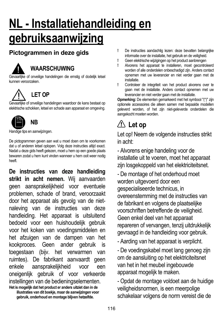 De instructies van deze handleiding strikt in acht nemen. Wij aanvaarden geen aansprakelijkheid voor eventuele problemen, schade of brand, veroorzaakt door het apparaat als gevolg van de nietnaleving van de instructies van deze handleiding. Het apparaat is uitsluitend bedoeld voor een huishoudelijk gebruik voor het koken van voedingsmiddelen en het afzuigen van de dampen van het kookproces. Geen ander gebruik is toegestaan (bijv. het verwarmen van ruimtes). De fabrikant aanvaardt geen enkele aansprakelijkheid voor een oneigenlijk gebruik of voor verkeerde instellingen van de bedieningselementen. Het is mogelijk dat het product er anders uitziet dan in de illustraties van dit boekje, maar de aanwijzingen voor gebruik, onderhoud en montage blijven hetzelfde.