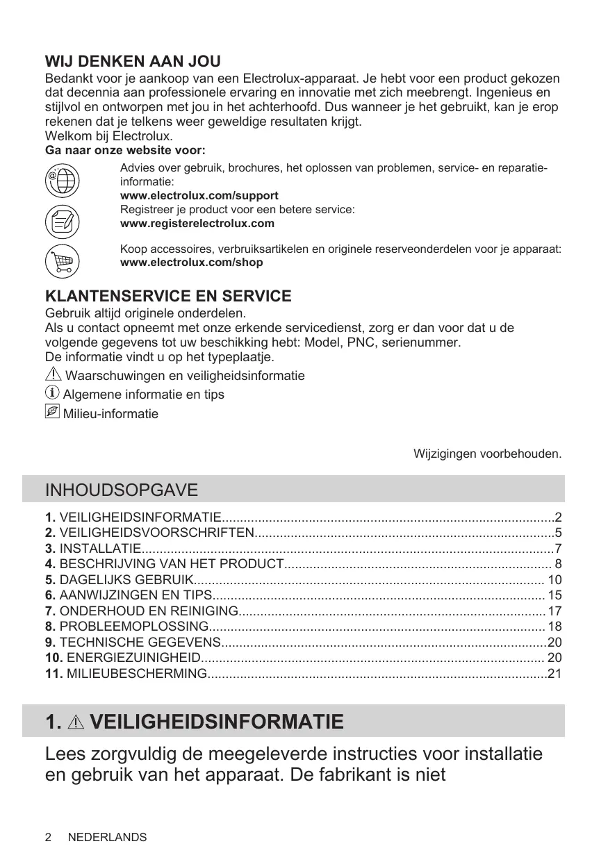 Bedankt voor je aankoop van een Electrolux-apparaat. Je hebt voor een product gekozen dat decennia aan professionele ervaring en innovatie met zich meebrengt. Ingenieus en stijlvol en ontworpen met jou in het achterhoofd. Dus wanneer je het gebruikt, kan je erop rekenen dat je telkens weer geweldige resultaten krijgt. Welkom bij Electrolux. Ga naar onze website voor: Advies over gebruik, brochures, het oplossen van problemen, service- en reparatieinformatie: www.electrolux.com/support Registreer je product voor een betere service: www.registerelectrolux.com Koop accessoires, verbruiksartikelen en originele reserveonderdelen voor je apparaat: www.electrolux.com/shop