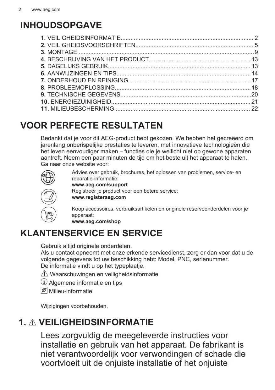 Bedankt dat je voor dit AEG-product hebt gekozen. We hebben het gecreëerd om jarenlang onberispelijke prestaties te leveren, met innovatieve technologieën die het leven eenvoudiger maken – functies die je wellicht niet op gewone apparaten aantreft. Neem een paar minuten de tijd om het beste uit het apparaat te halen. Ga naar onze website voor: Advies over gebruik, brochures, het oplossen van problemen, service- en reparatie-informatie: www.aeg.com/support Registreer je product voor een betere service: www.registeraeg.com Koop accessoires, verbruiksartikelen en originele reserveonderdelen voor je apparaat: www.aeg.com/shop