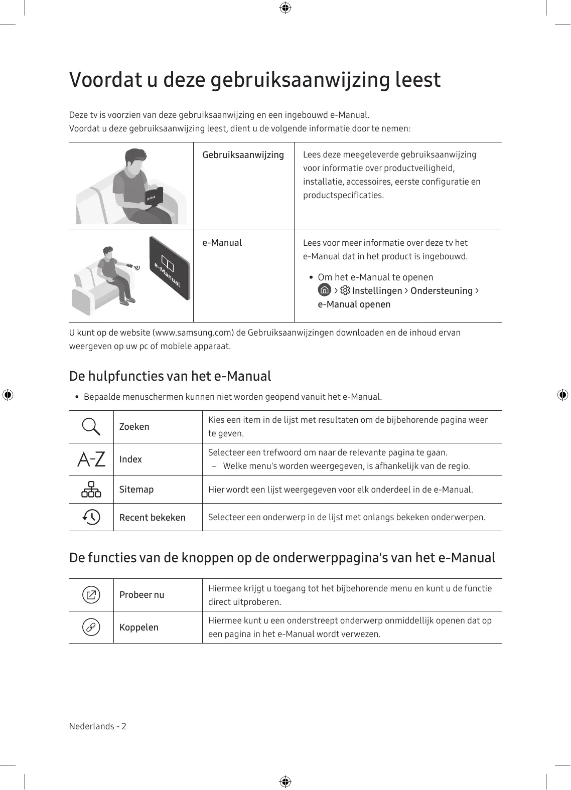Voordat u deze gebruiksaanwijzing leest Deze tv is voorzien van deze gebruiksaanwijzing en een ingebouwd e-Manual. Voordat u deze gebruiksaanwijzing leest, dient u de volgende informatie door te nemen: