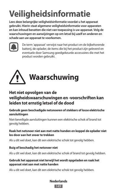 Le non-respect des consignes de sécurité peut entraîner des blessures graves, voire la mort N’utilisez pas de prises et de cordons d’alimentation endommagé(e)s ou de prises électriques mal fixées Les branchements non sécurisés engendrent un risque d’électrocution ou d’incendie. Ne touchez pas le cordon d’alimentation avec les mains mouillées et ne déconnectez pas le chargeur en tirant sur le cordon Vous risquez de vous électrocuter. Ne tordez et n’endommagez pas le cordon d’alimentation Vous risquez de vous électrocuter ou de provoquer un incendie. N’utilisez pas l’appareil avec les mains mouillées ou lorsque celui-ci est en cours de chargement Vous risquez de vous électrocuter.