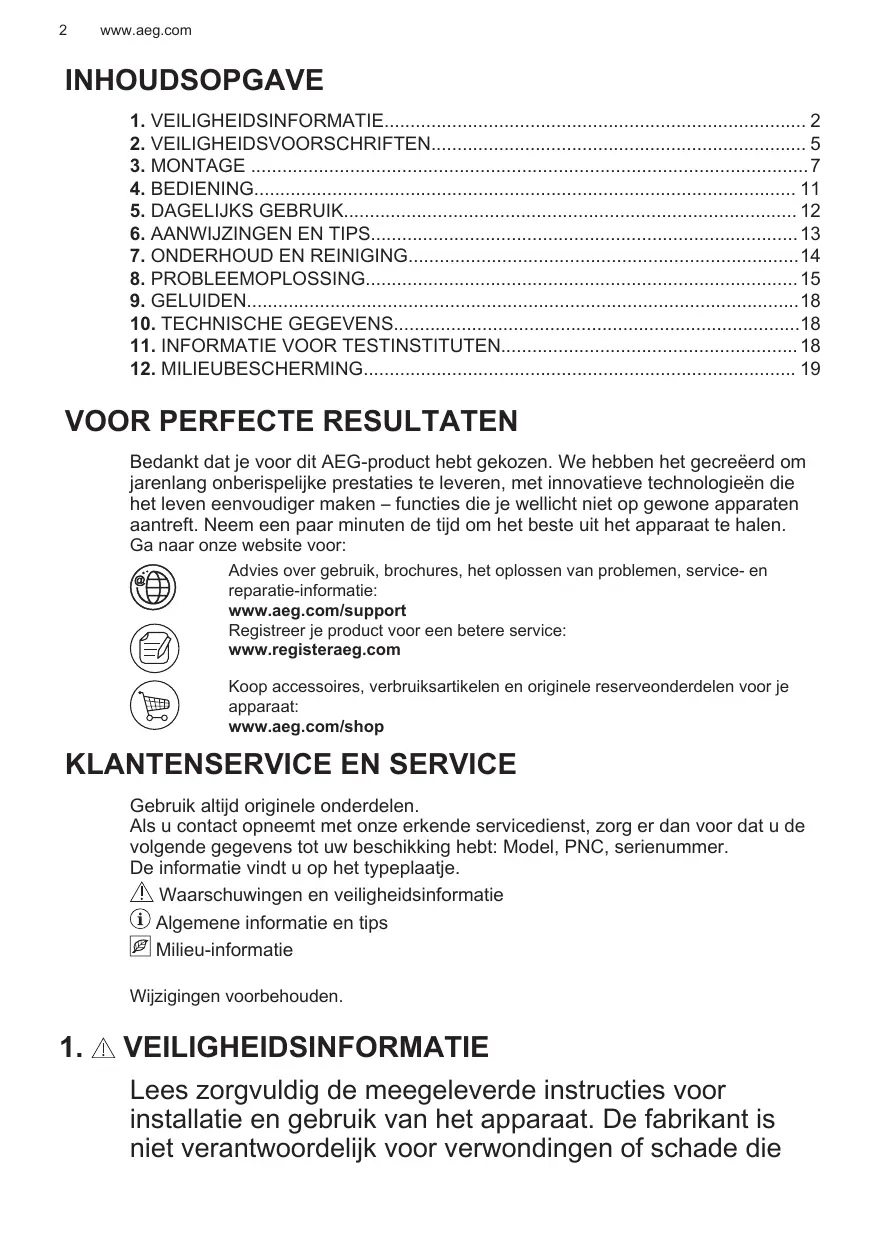 Bedankt dat je voor dit AEG-product hebt gekozen. We hebben het gecreëerd om jarenlang onberispelijke prestaties te leveren, met innovatieve technologieën die het leven eenvoudiger maken – functies die je wellicht niet op gewone apparaten aantreft. Neem een paar minuten de tijd om het beste uit het apparaat te halen. Ga naar onze website voor: Advies over gebruik, brochures, het oplossen van problemen, service- en reparatie-informatie: www.aeg.com/support Registreer je product voor een betere service: www.registeraeg.com Koop accessoires, verbruiksartikelen en originele reserveonderdelen voor je apparaat: www.aeg.com/shop