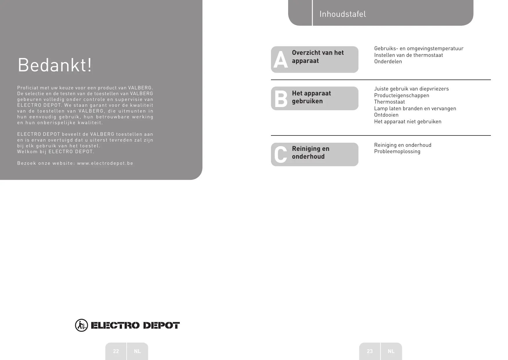 Proficiat met uw keuze voor een product van VALBERG. De selectie en de testen van de toestellen van VALBERG gebeuren volledig onder controle en supervisie van ELECTRO DEPOT. We staan garant voor de kwaliteit van de toestellen van VALBERG, die uitmuntein hun eenvoudig gebruik, hun betrouwbare werkinq en hun onberispelijke kwaliteit.