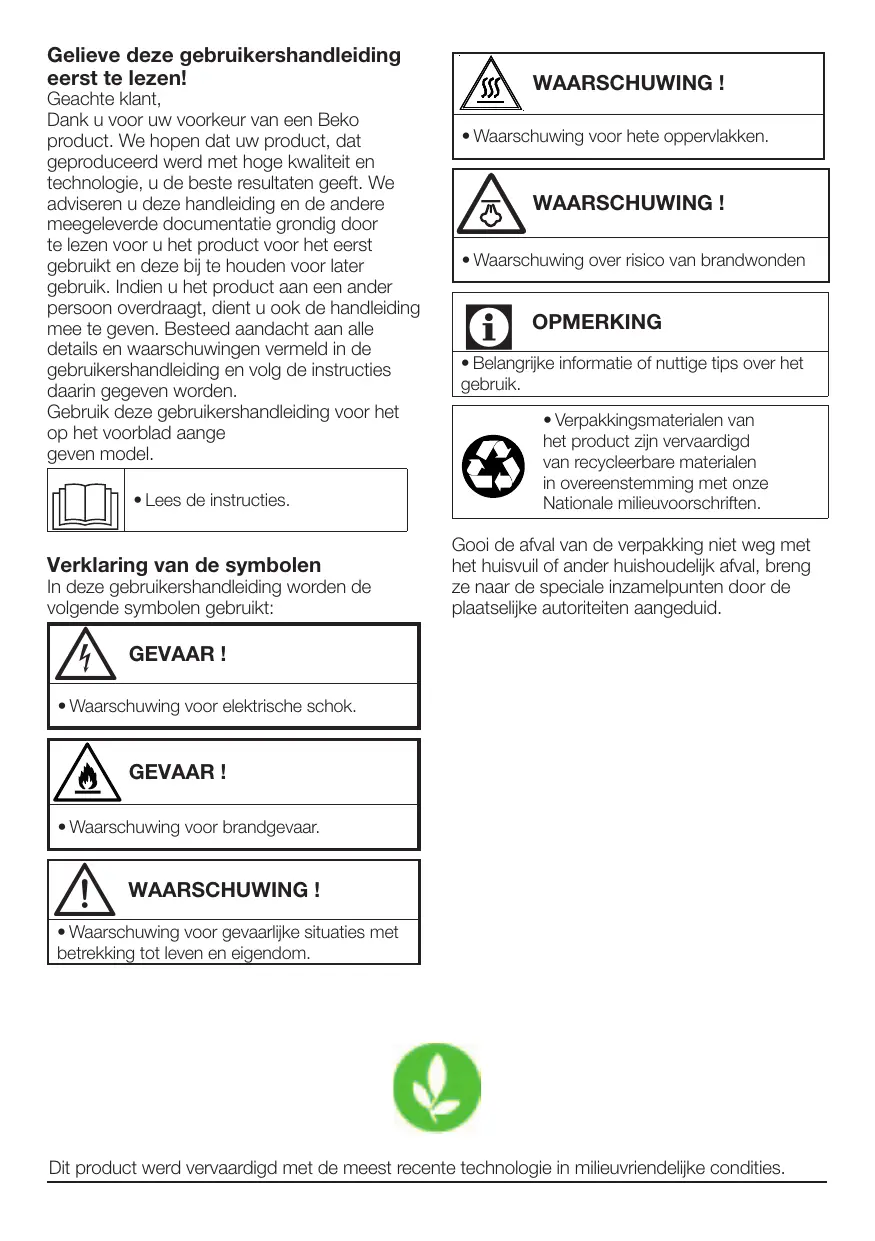 Geachte klant, Dank u voor uw voorkeur van een Beko product. We hopen dat uw product, dat geproduceerd werd met hoge kwaliteit en technologie, u de beste resultaten geeft. We adviseren u deze handleiding en de andere meegeleverde documentatie grondig door te lezen voor u het product voor het eerst gebruikt en deze bij te houden voor later gebruik. Indien u het product aan een ander persoon overdraagt, dient u ook de handleiding mee te geven. Besteed aandacht aan alle details en waarschuwingen vermeld in de gebruikershandleiding en volg de instructies daarin gegeven worden. Gebruik deze gebruikershandleiding voor het op het voorblad aange geven model. • Lees de instructies.