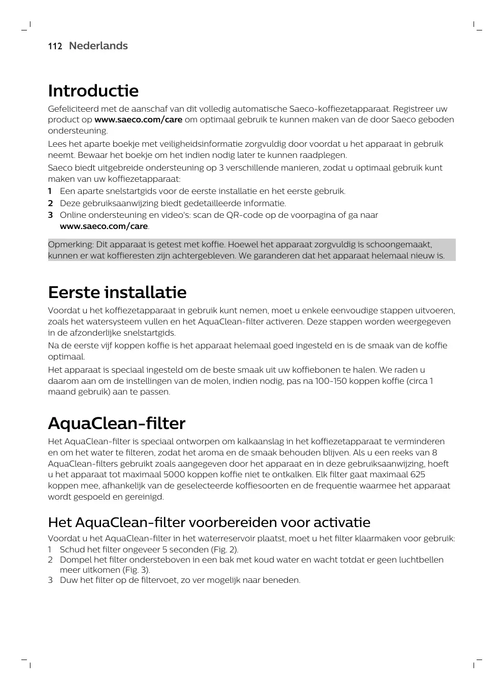 Uitloop van koffieleiding Nederlands 112 Nederlands Introductie Gefeliciteerd met de aanschaf van dit volledig automatische Saeco-koffiezetapparaat. Registreer uw product op www.saeco.com/care om optimaal gebruik te kunnen maken van de door Saeco geboden ondersteuning. Lees het aparte boekje met veiligheidsinformatie zorgvuldig door voordat u het apparaat in gebruik neemt. Bewaar het boekje om het indien nodig later te kunnen raadplegen. Saeco biedt uitgebreide ondersteuning op 3 verschillende manieren, zodat u optimaal gebruik kunt maken van uw koffiezetapparaat: 1 Een aparte snelstartgids voor de eerste installatie en het eerste gebruik. 2 Deze gebruiksaanwijzing biedt gedetailleerde informatie. 3 Online ondersteuning en video's: scan de QR-code op de voorpagina of ga naar www.saeco.com/care. Opmerking: Dit apparaat is getest met koffie. Hoewel het apparaat zorgvuldig is schoongemaakt, kunnen er wat koffieresten zijn achtergebleven. We garanderen dat het apparaat helemaal nieuw is. Eerste installatie Voordat u het koffiezetapparaat in gebruik kunt nemen, moet u enkele eenvoudige stappen uitvoeren, zoals het watersysteem vullen en het AquaClean-filter activeren. Deze stappen worden weergegeven in de afzonderlijke snelstartgids. Na de eerste vijf koppen koffie is het apparaat helemaal goed ingesteld en is de smaak van de koffie optimaal. Het apparaat is speciaal ingesteld om de beste smaak uit uw koffiebonen te halen. We raden u daarom aan om de instellingen van de molen, indien nodig, pas na 100-150 koppen koffie (circa 1 maand gebruik) aan te passen. AquaClean-filter Het AquaClean-filter is speciaal ontworpen om kalkaanslag in het koffiezetapparaat te verminderen en om het water te filteren, zodat het aroma en de smaak behouden blijven. Als u een reeks van 8 AquaClean-filters gebruikt zoals aangegeven door het apparaat en in deze gebruiksaanwijzing, hoeft u het apparaat tot maximaal 5000 koppen koffie niet te ontkalken. Elk filter gaat maximaal 625 koppen mee, afhankelijk van de geselecteerde koffiesoorten en de frequentie waarmee het apparaat wordt gespoeld en gereinigd. Het AquaClean-filter voorbereiden voor activatie Voordat u het AquaClean-filter in het waterreservoir plaatst, moet u het filter klaarmaken voor gebruik: 1 Schud het filter ongeveer 5 seconden (Fig. 2). 2 Dompel het filter ondersteboven in een bak met koud water en wacht totdat er geen luchtbellen meer uitkomen (Fig. 3). 3 Duw het filter op de filtervoet, zo ver mogelijk naar beneden. Nederlands 113 Het AquaClean-filter activeren Elk nieuw AquaClean-filter dat u installeert, moet vóór gebruik worden geactiveerd. Wanneer u het AquaClean-filter activeert, controleert het apparaat de capaciteit van het AquaClean-filter en het aantal reeds gebruikte filters. Er zijn drie manieren om het AquaClean-filter te activeren.