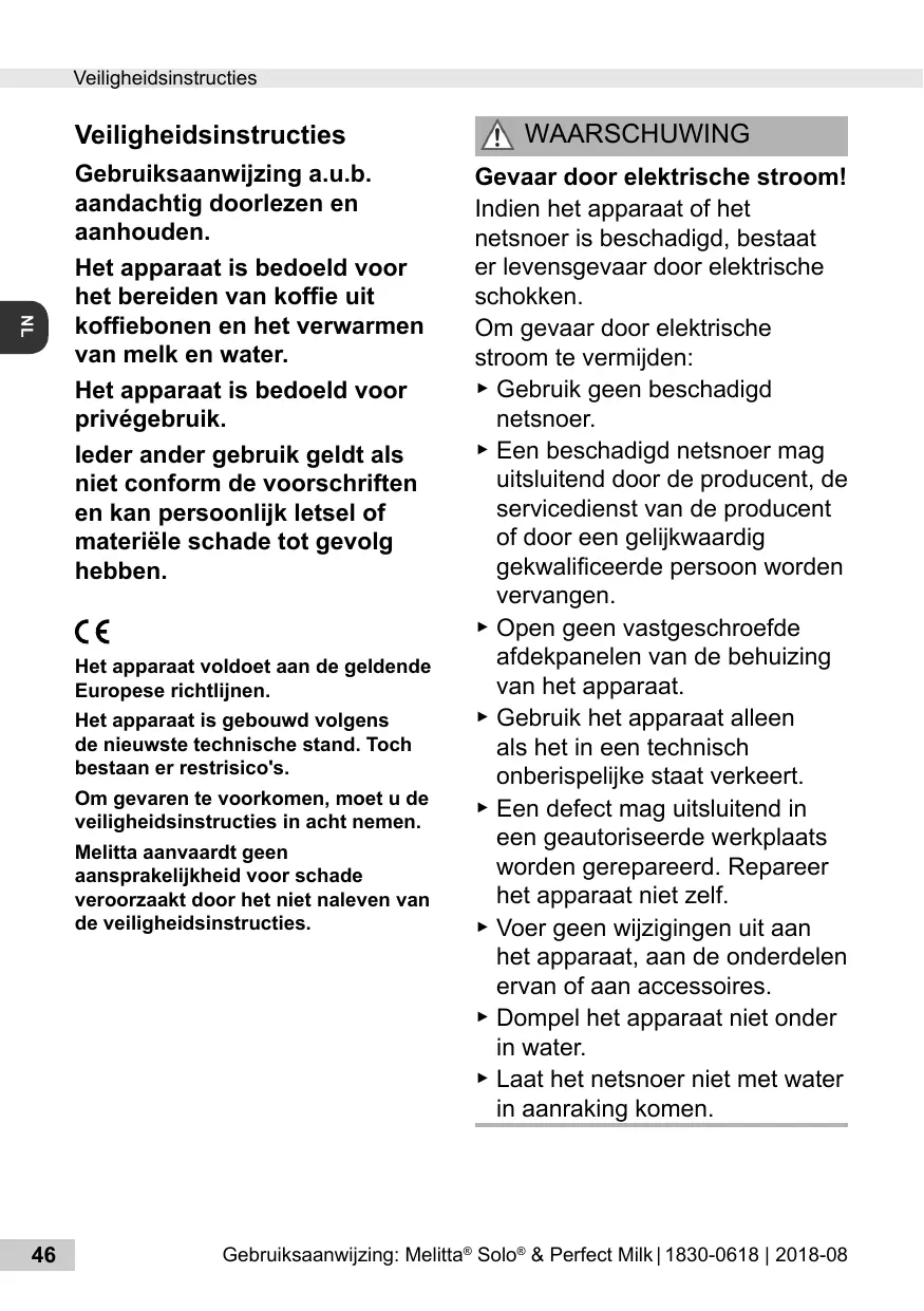 Gebruiksaanwijzing: Melitta® Solo® & Perfect Milk | 1830-0618 | 2018-08