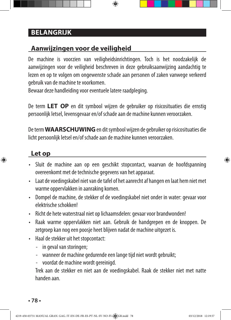 • Cette machine est destinée uniquement à un usage domestique et elle n'est pas indiquée pour une utilisation dans des cantines ou dans les espaces cuisine de magasins, bureaux, fermes ou d'autres environnements de travail. • Toujours poser la machine sur une surface plane et stable. • Ne pas placer la machine sur des surfaces chaudes, proches de fours chauds, de réchauffeurs ou d'autres sources de chaleur similaires. • 43 • 4219-450-03731 MANUAL GRAN. GAG. IT-EN-DE-FR-ES-PT-NL-SV-NO-FI-DA-GR.indd 43
