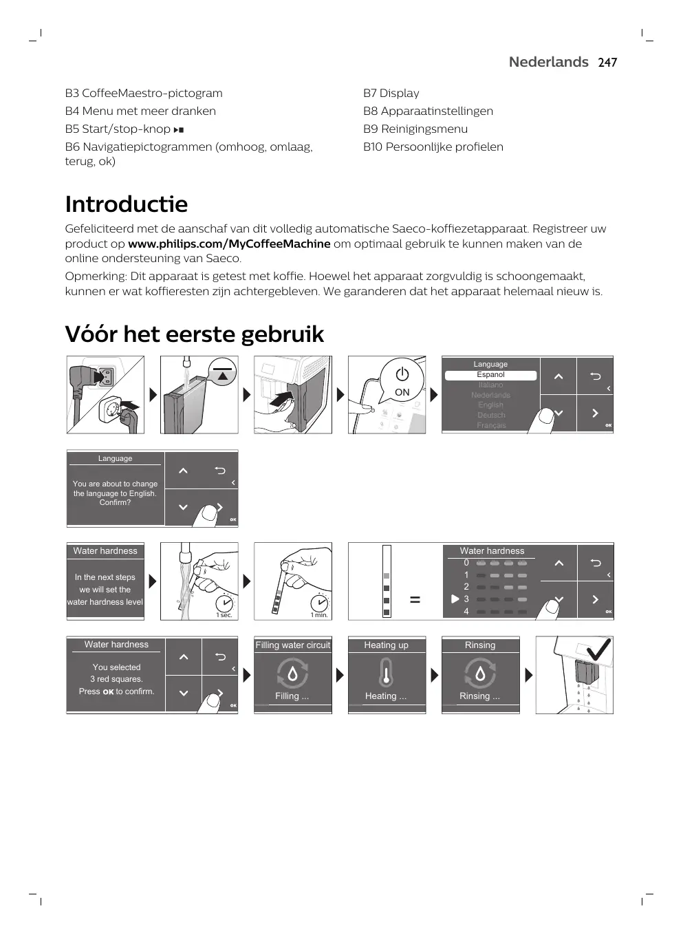 Introductie Gefeliciteerd met de aanschaf van dit volledig automatische Saeco-koffiezetapparaat. Registreer uw product op www.philips.com/MyCoffeeMachine om optimaal gebruik te kunnen maken van de online ondersteuning van Saeco. Opmerking: Dit apparaat is getest met koffie. Hoewel het apparaat zorgvuldig is schoongemaakt, kunnen er wat koffieresten zijn achtergebleven. We garanderen dat het apparaat helemaal nieuw is.
