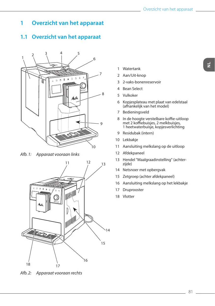 Overzicht van het apparaat81 1.1 Overzicht van het apparaat81 1.2 Overzicht van het bedieningsveld82