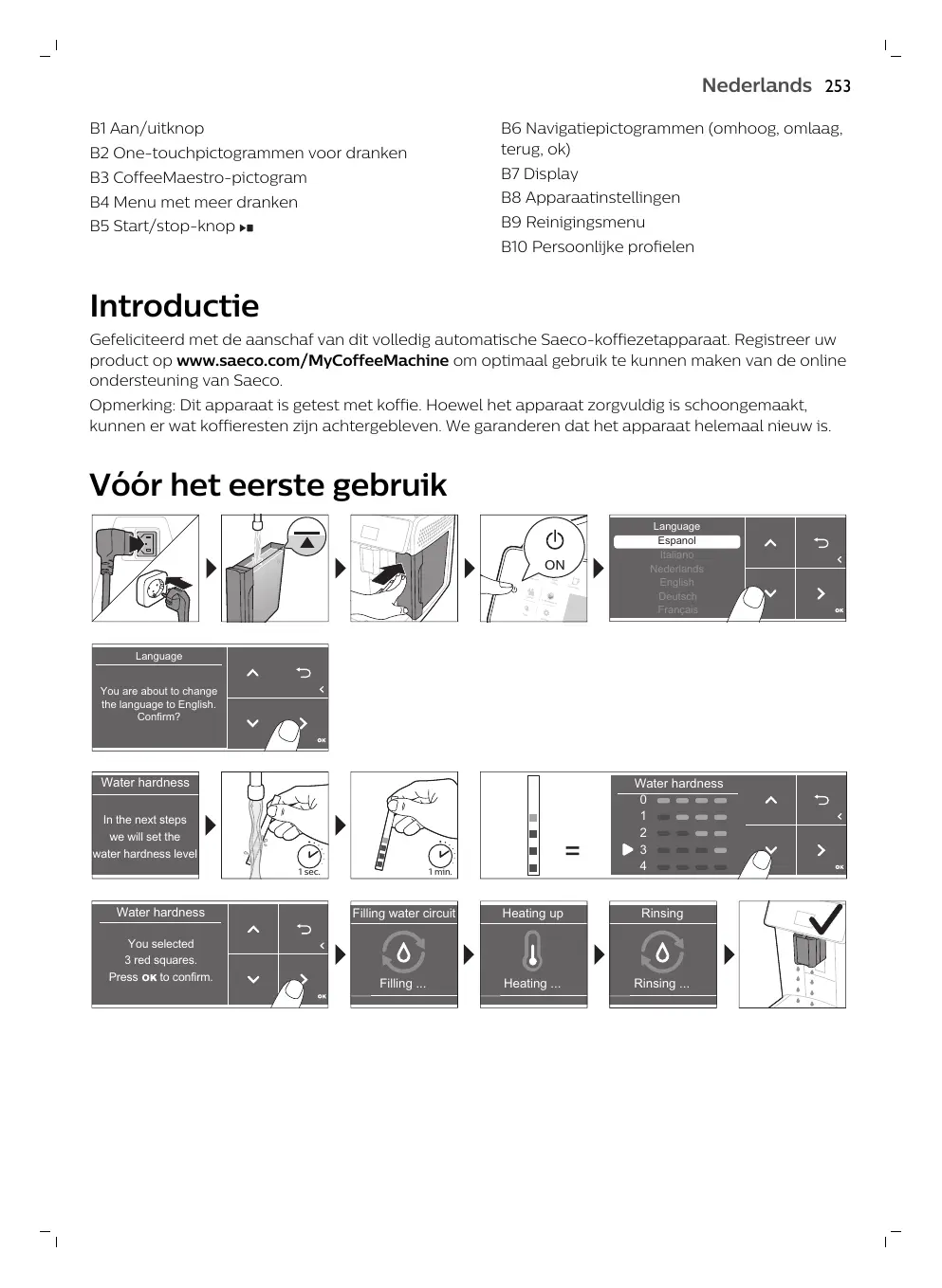 Introductie Gefeliciteerd met de aanschaf van dit volledig automatische Saeco-koffiezetapparaat. Registreer uw product op www.saeco.com/MyCoffeeMachine om optimaal gebruik te kunnen maken van de online ondersteuning van Saeco. Opmerking: Dit apparaat is getest met koffie. Hoewel het apparaat zorgvuldig is schoongemaakt, kunnen er wat koffieresten zijn achtergebleven. We garanderen dat het apparaat helemaal nieuw is.