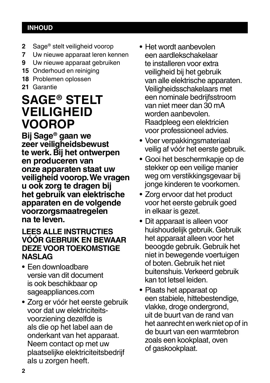 Sage® stelt veiligheid voorop Uw nieuwe apparaat leren kennen Uw nieuwe apparaat gebruiken Onderhoud en reiniging Problemen oplossen Garantie SAGE® STELT VEILIGHEID VOOROP Bij Sage® gaan we zeer veiligheidsbewust te werk. Bij het ontwerpen en produceren van onze apparaten staat uw veiligheid voorop. We vragen u ook zorg te dragen bij het gebruik van elektrische apparaten en de volgende voorzorgsmaatregelen na te leven.