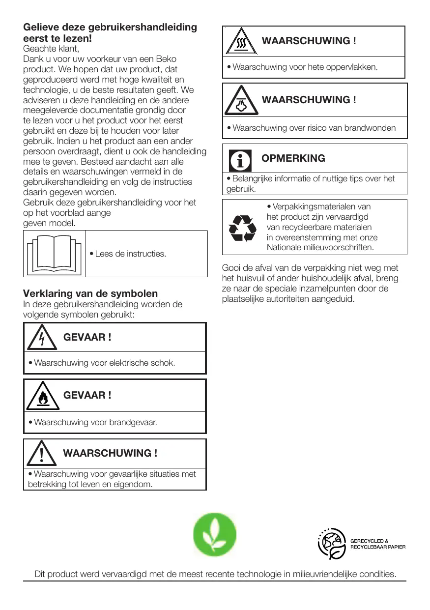- Waarschuwing voor gevaarlijke situaties met betrekking tot leven en eigendom. Dit product werd vervaardigd met de meest recente technologie in milieuvriendelijke condities. 1 Belangrijke milieu- en veiligheidsinstructies