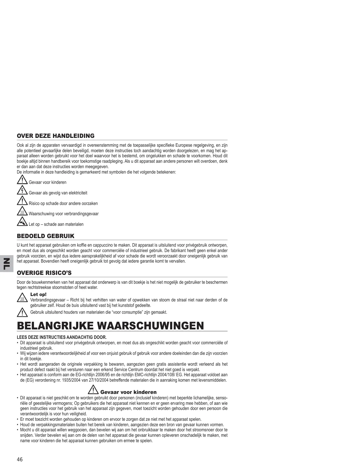 BEDOELD GEBRUIK NL U kunt het apparaat gebruiken om koffie en cappuccino te maken. Dit apparaat is uitsluitend voor privégebruik ontworpen, en moet dus als ongeschikt worden geacht voor commerciële of industrieel gebruik. De fabrikant heeft geen enkel ander gebruik voorzien, en wijst dus iedere aansprakelijkheid af voor schade die wordt veroorzaakt door oneigenlijk gebruik van het apparaat. Bovendien heeft oneigenlijk gebruik tot gevolg dat iedere garantie komt te vervallen.