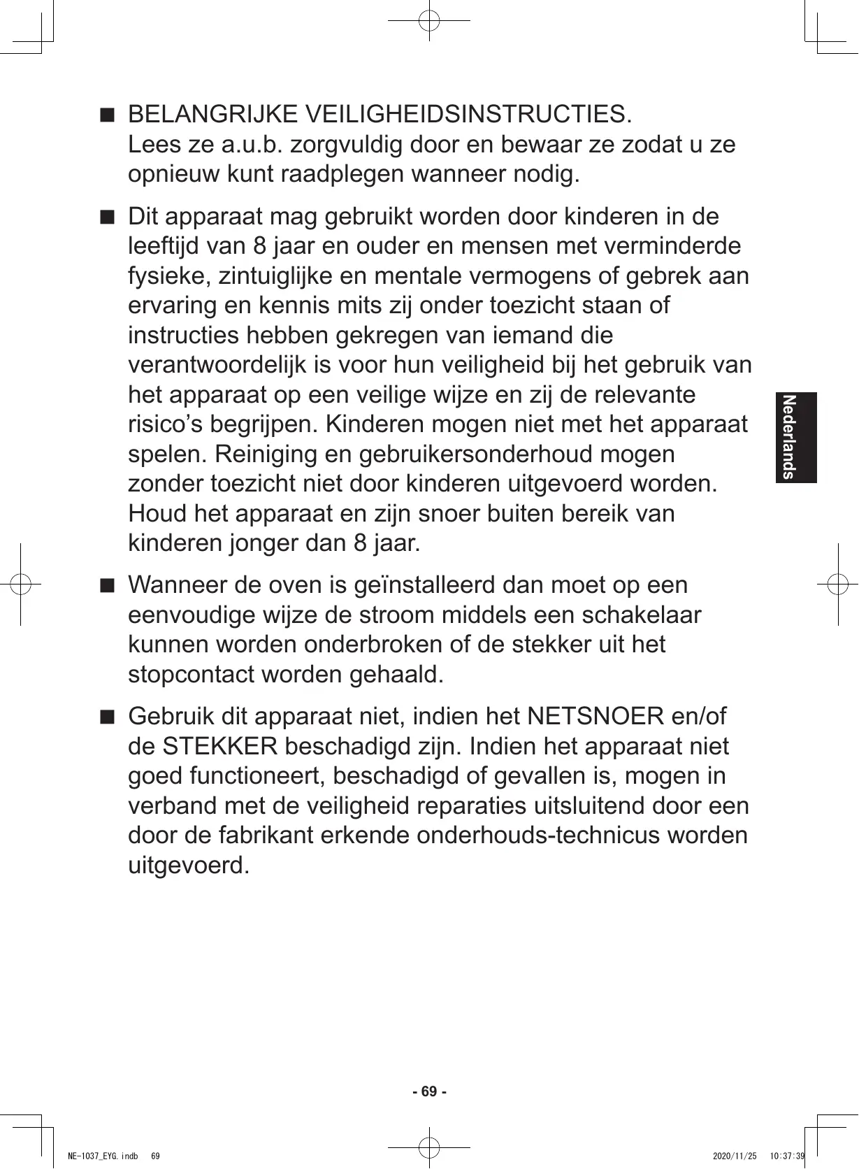 Dit apparaat mag gebruikt worden door kinderen in de leeftijd van 8 jaar en ouder en mensen met verminderde fysieke, zintuiglijke en mentale vermogens of gebrek aan ervaring en kennis mits zij onder toezicht staan of instructies hebben gekregen van iemand die verantwoordelijk is voor hun veiligheid bij het gebruik van het apparaat op een veilige wijze en zij de relevante risico’s begrijpen. Kinderen mogen niet met het apparaat spelen. Reiniging en gebruikersonderhoud mogen zonder toezicht niet door kinderen uitgevoerd worden. Houd het apparaat en zijn snoer buiten bereik van kinderen jonger dan 8 jaar. Wanneer de oven is geïnstalleerd dan moet op een eenvoudige wijze de stroom middels een schakelaar kunnen worden onderbroken of de stekker uit het stopcontact worden gehaald. Gebruik dit apparaat niet, indien het NETSNOER en/of de STEKKER beschadigd zijn. Indien het apparaat niet goed functioneert, beschadigd of gevallen is, mogen in verband met de veiligheid reparaties uitsluitend door een door de fabrikant erkende onderhouds-technicus worden uitgevoerd.