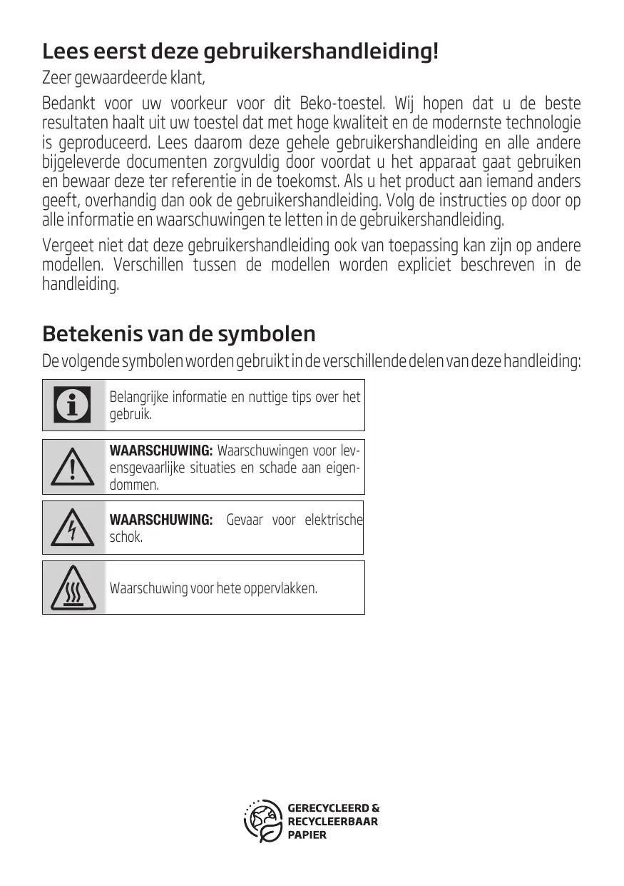 panneau Four à Micro-Ondes / Manuel de l’Utilisateur 83 / FR Lees eerst deze gebruikershandleiding! Zeer gewaardeerde klant, Bedankt voor uw voorkeur voor dit Beko-toestel. Wij hopen dat u de beste resultaten haalt uit uw toestel dat met hoge kwaliteit en de modernste technologie is geproduceerd. Lees daarom deze gehele gebruikershandleiding en alle andere bijgeleverde documenten zorgvuldig door voordat u het apparaat gaat gebruiken en bewaar deze ter referentie in de toekomst. Als u het product aan iemand anders geeft, overhandig dan ook de gebruikershandleiding. Volg de instructies op door op alle informatie en waarschuwingen te letten in de gebruikershandleiding. Vergeet niet dat deze gebruikershandleiding ook van toepassing kan zijn op andere modellen. Verschillen tussen de modellen worden expliciet beschreven in de handleiding. Betekenis van de symbolen De volgende symbolen worden gebruikt in de verschillende delen van deze handleiding: