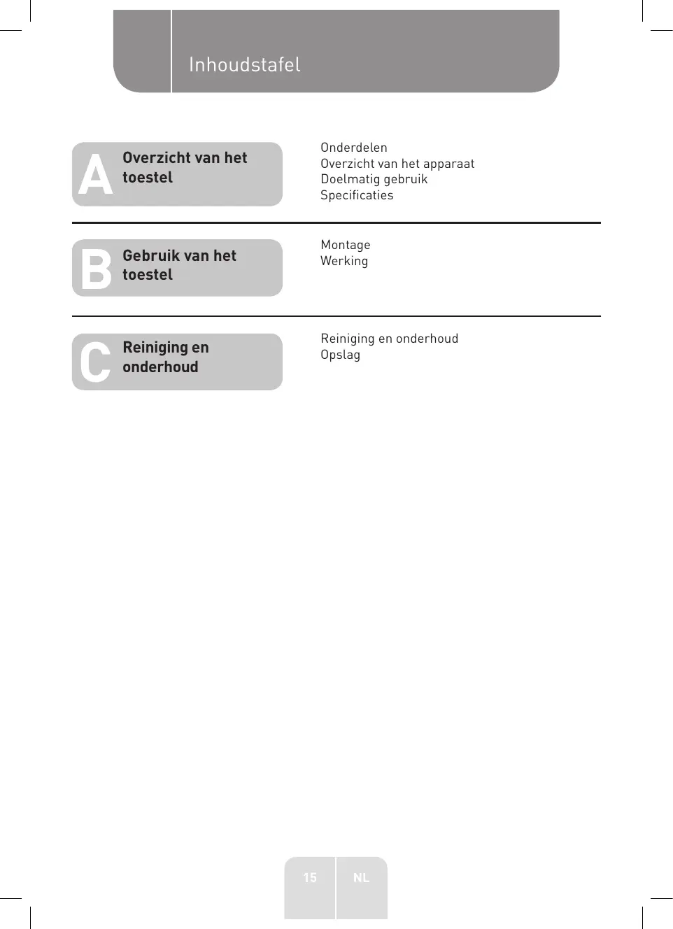 Reiniging en onderhoud Onderdelen Overzicht van het apparaat Doelmatig gebruik Specificaties Montage Werking Reiniging en onderhoud Opslag