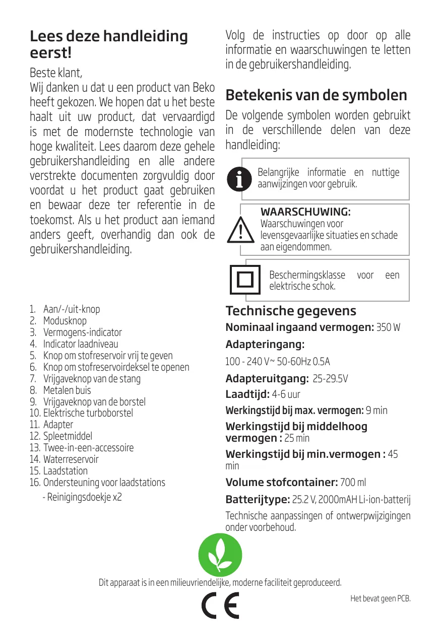 Période de fonctionnement à puissance minimum: 45 minutes Volume du bac à poussière : 700 ml Type de batterie: Batterie Li-ion 25,2 V, 2000 mAH Sous réserve de modifications techniques et de conception.