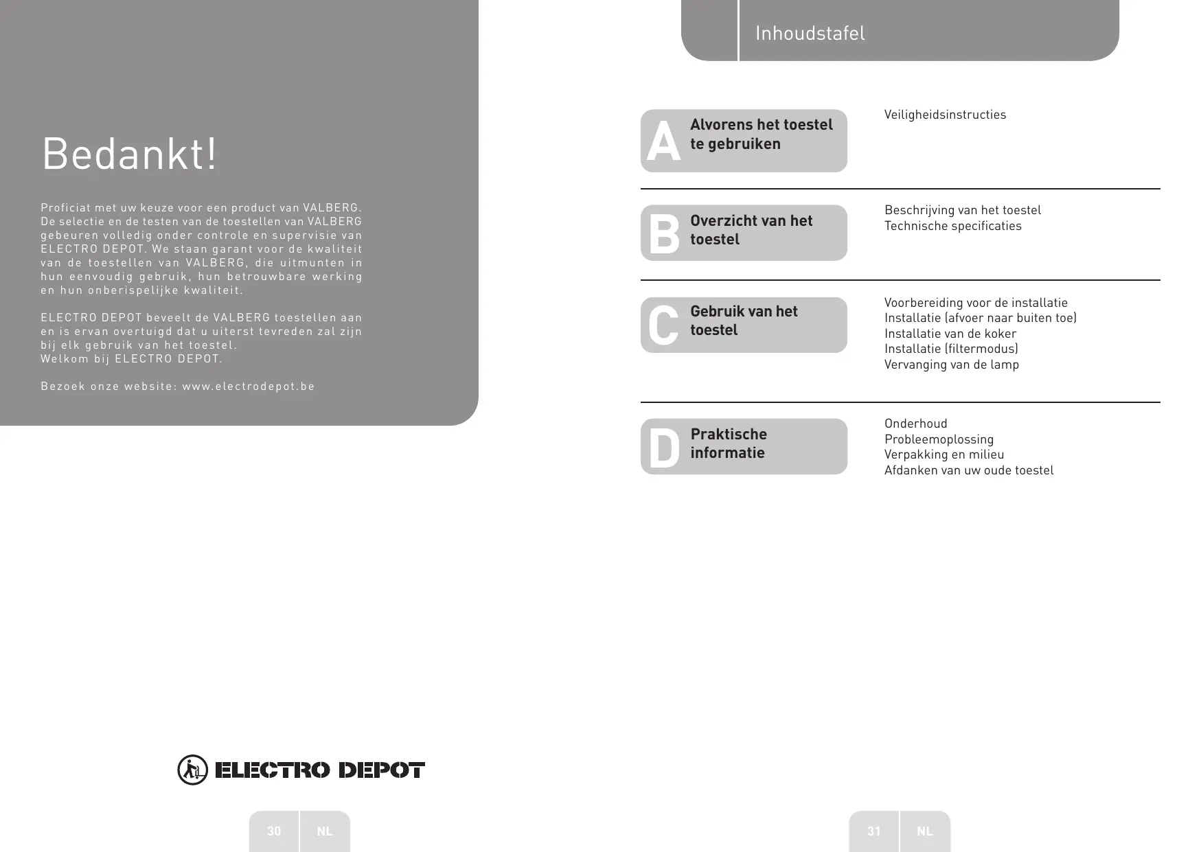 Proficiat met uw keuze voor een product van VALBERG. De selectie en de testen van de toestellen van VALBERG gebeuren volledig onder controle en supervisie van ELECTRO DEPOT. We staan garant voor de kwaliteit van de toestellen van VALBERG, die uitmuntein hun eenvoudig gebruik, hun betrouwbare werkinq en hun onberispelijke kwaliteit.