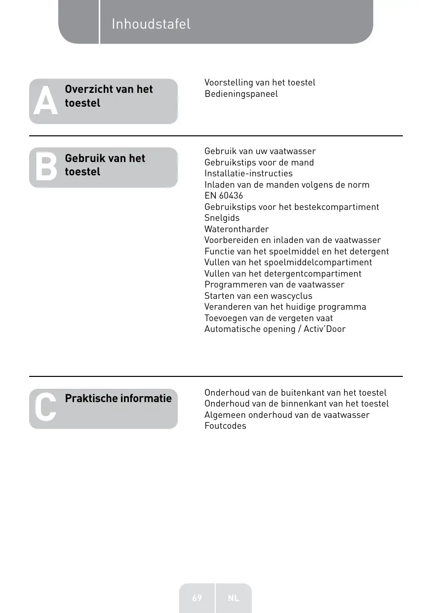 5. Verwijder de filter onderaan de kuip en gebruik een spons om het water in de decanteringskuip te absorberen. Na elke afwasbeurt • Na elke afwasbeurt sluit u de watertoevoer van het toestel af en laat u de deur op een kier staan om de vorming van vocht en geuren aan de binnenkant te voorkomen. Wanneer de vaatwasser lange tijd niet gebruikt wordt • We raden aan een wascyclus leeg te laten draaien en vervolgens de stekker uit het stopcontact te halen, de watertoevoer af te sluiten en de deur van het toestel op een kier te zetten. Dit zal ertoe bijdragen dat de deurafdichtingen langer meegaan en dat de vorming van geuren in het toestel wordt verhinderd. Instrucciones de instalación Carga de las cestas según la norma EN60436 Consejos de utilización del compartimento de cubiertos Guía de utilización rápida Descalcificador de agua Preparar y cargar la vajilla Función del abrillantador y del detergente Llenado del compartimento de abrillantador Llenado del compartimento de detergente Programación del lavavajillas Inicio de un ciclo de lavado Cambio de programa durante un ciclo Añadir vajilla olvidada Apertura automática