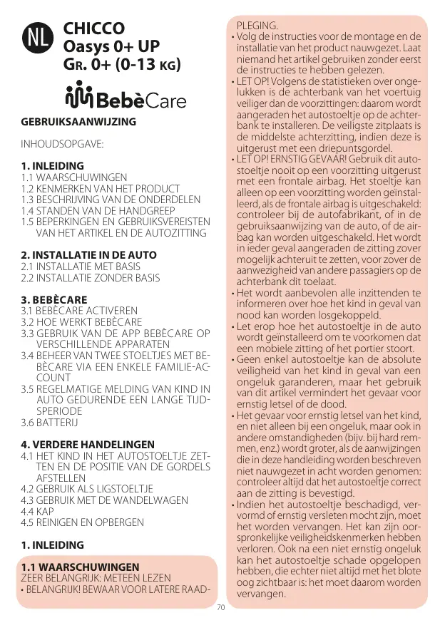 GEBRUIKSAANWIJZING INHOUDSOPGAVE: 1. INLEIDING 1.1 WAARSCHUWINGEN 1.2 KENMERKEN VAN HET PRODUCT 1.3 BESCHRIJVING VAN DE ONDERDELEN 1.4 STANDEN VAN DE HANDGREEP 1.5 BEPERKINGEN EN GEBRUIKSVEREISTEN VAN HET ARTIKEL EN DE AUTOZITTING 2. INSTALLATIE IN DE AUTO 2.1 INSTALLATIE MET BASIS 2.2 INSTALLATIE ZONDER BASIS 3. BEBÈCARE 3.1 BEBÈCARE ACTIVEREN 3.2 HOE WERKT BEBÈCARE 3.3 GEBRUIK VAN DE APP BEBÈCARE OP VERSCHILLENDE APPARATEN 3.4 BEHEER VAN TWEE STOELTJES MET BE BÈCARE VIA EEN ENKELE FAMILIEAC COUNT 3.5 REGELMATIGE MELDING VAN KIND IN AUTO GEDURENDE EEN LANGE TIJD SPERIODE 3.6 BATTERIJ 4. VERDERE HANDELINGEN 4.1 HET KIND IN HET AUTOSTOELTJE ZETTEN EN DE POSITIE VAN DE GORDELS AFSTELLEN 4.2 GEBRUIK ALS LIGSTOELTJE 4.3 GEBRUIK MET DE WANDELWAGEN 4.4 KAP 4.5 REINIGEN EN OPBERGEN 1. INLEIDING 1.1 WAARSCHUWINGEN ZEER BELANGRIJK: METEEN LEZEN • BELANGRIJK! BEWAAR VOOR LATERE RAAD70