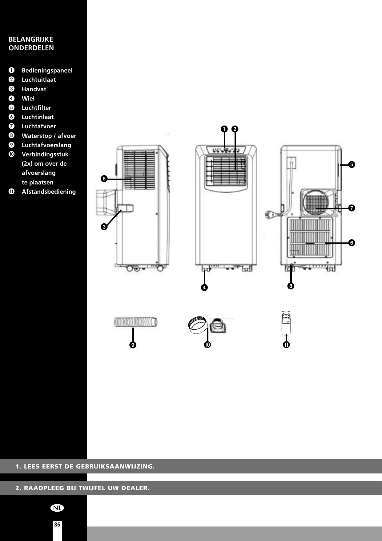 • N’utilisez jamais le climatiseur sans le filtre. Ne déplacez pas l’appareil. Des mouvements brusques peuvent provoquer des fuites d’eau. Eteignez d’abord l’appareil et retirez la fiche de la prise de courant. Placez une casserole ou un petit récipient approprié sur le sol sous l’ouverture d’évacuation. Retirez le bouchon en caoutchouc  et laissez l’eau s’écouler (± 0.8 L). Replacez le bouchon sur l’évacuation  et remettez-le en marche. La lampe témoin