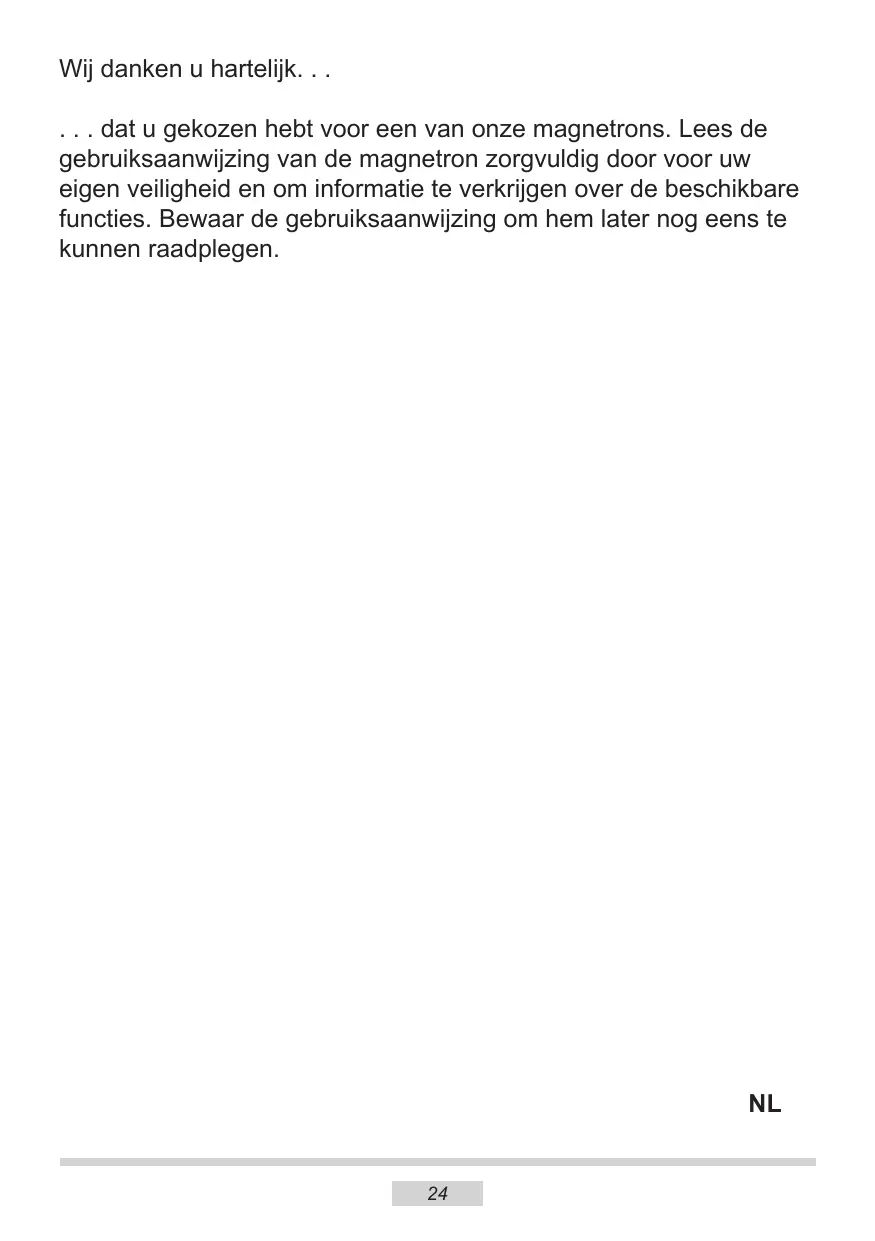 Wij danken u hartelijk. . . . . . dat u gekozen hebt voor een van onze magnetrons. Lees de gebruiksaanwijzing van de magnetron zorgvuldig door voor uw eigen veiligheid en om informatie te verkrijgen over de beschikbare functies. Bewaar de gebruiksaanwijzing om hem later nog eens te kunnen raadplegen.